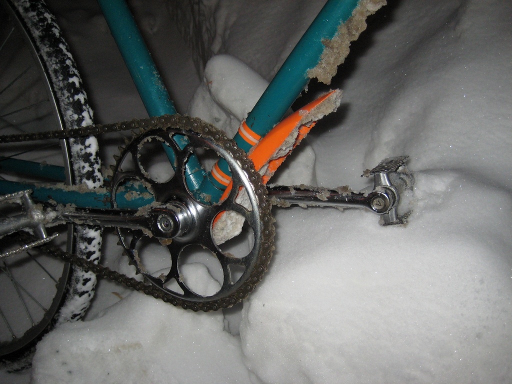 Вчера с утра -6, пошел легкий снежок, слегка припорошило дороги. Такое не страшно — полуслик при 4,5атм тонкий слой снега просто прорезает и держит почти как на сухом асфальте. А днем снег усилился, дороги укатали, тротуары утоптали. Но до дома таки доехал )))