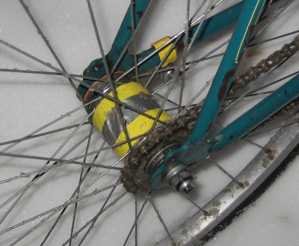 Тот же самый строительный вспененный утеплитель, прямоугольной формы (6см х 17см х 10мм) и обёрнутый вокруг тормозной втулки типа "Торпедо". Чтобы не разворачивался, обмотан скотчем и "для красоты" — парой полосок жёлтенькой изоленты. Если втулка забита литолом-солидолом он вряд ли спасёт от замерзания смазки и "прокрутов", но жидкая смазка по моим ощущениям замерзает меньше, втулка в холода работает приятнее и лучше.