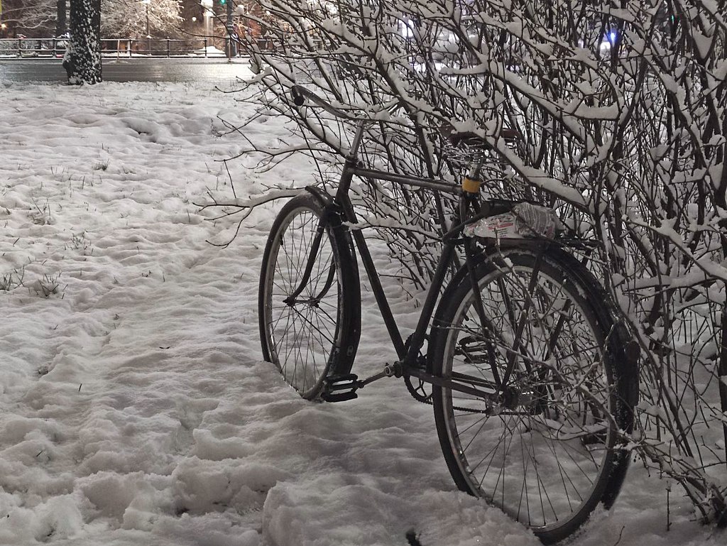 Надеваю легкую горнолыжную куртку поверх футболки и флиски, синтепоновые штаны поверх рабочих брюк, синтепоновые варежки, шапка+бафф+капюшон, трекинговые ботинки. Если ехать, то совсем не мерзну. Хороший принцип для меня это равномерная тёплость всех частей одежды, то есть, пусть лучше будет всё не очень тёплое, но одинаково не очень тёплое. Второе наблюдение, это то, что самое важное это обувь и варежки, потом штаны, потом куртка.