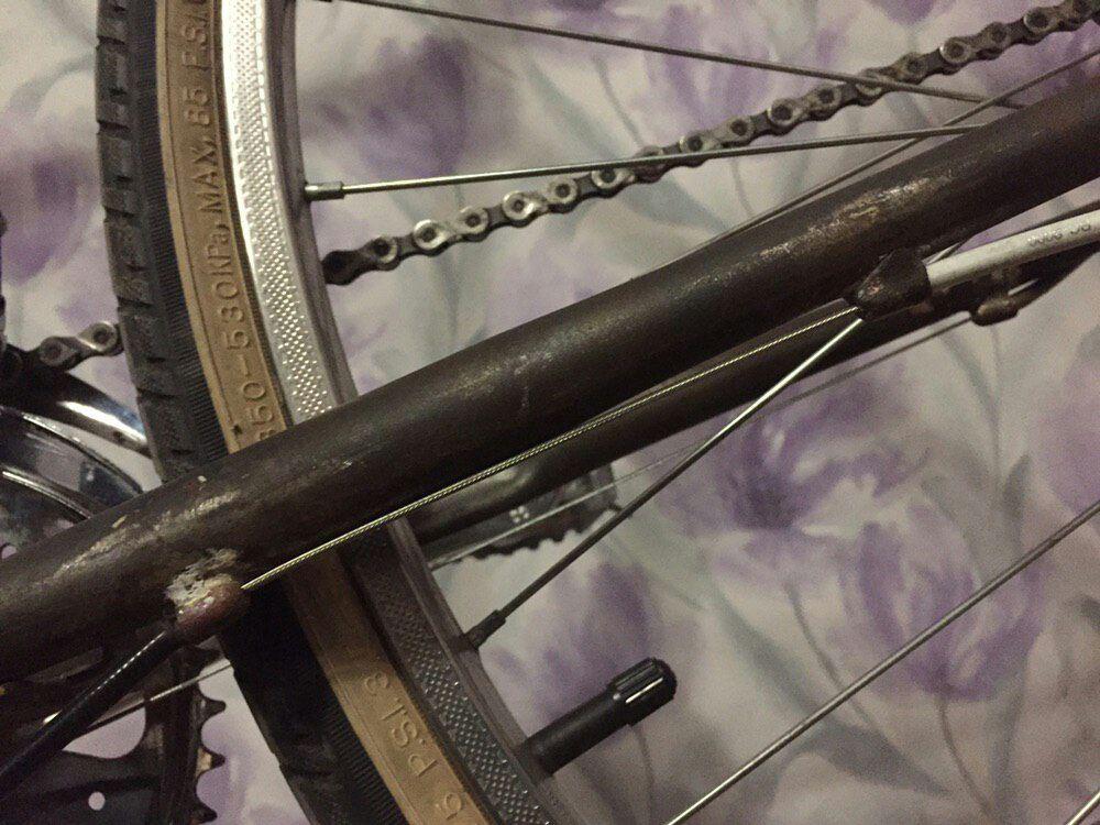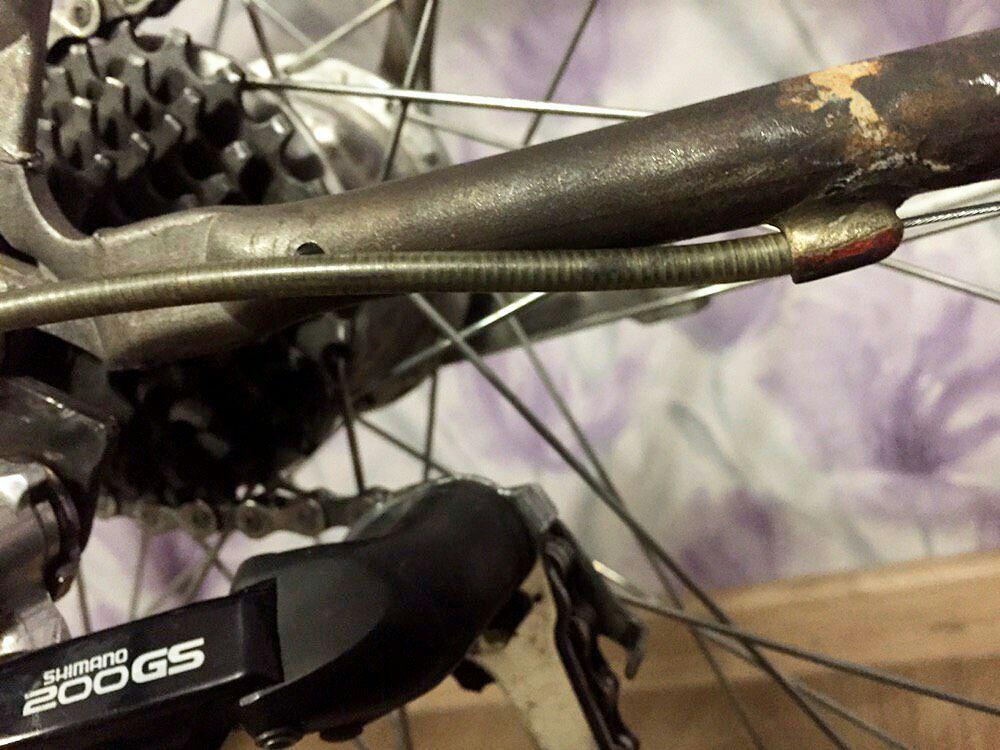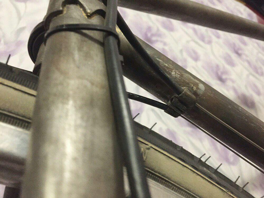 Сенс двух бонок — крепление рубашки. Была опробована прямая проводка как на перекидке — из за большого усилия на ручке возрастало трение. У перекидочного троса натяг не такой сильный, он просто по металлу нормально скользит. А тормозной — пришлось прятать в рубашку в месте поворота.
