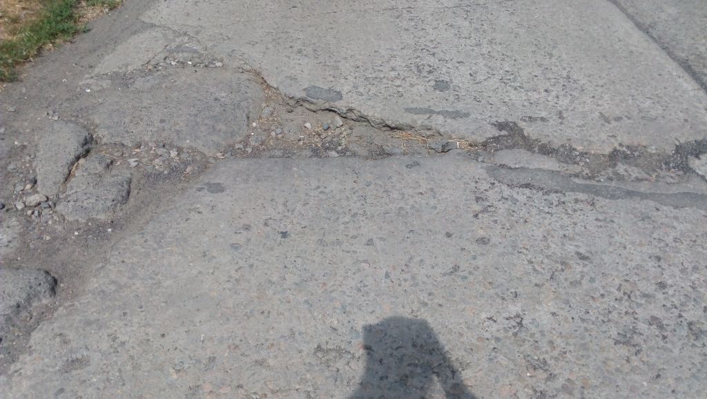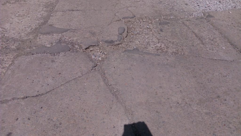 По центральной улице всюду колдобины, ровно только на боковых улицах, где асфальт не планировался. Там более-менее ровно бетонку клали.