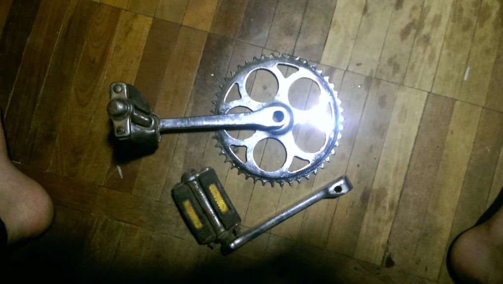 Сегодня пришла звезда с шатунами, 40 грн. Как и предсказывал коллега kisa, походу индо-китай. Никаких опознавательных знаков, кроме букв L и R не нашел img/ac. Радует 2 вещи, с виду очень добротный толстый метал, для начала попробовал согнуть-сломать — не получилось. Второе что проверил педали ХВЗ вкручиваются как родные.