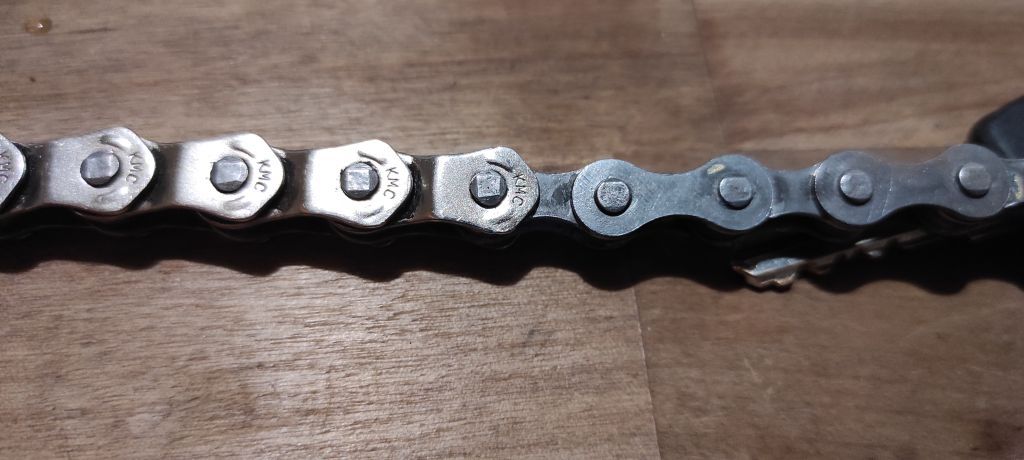 Старенькую цпь нужно смазать моторным маслом, подвигать все звенья и поставить на велосипед.