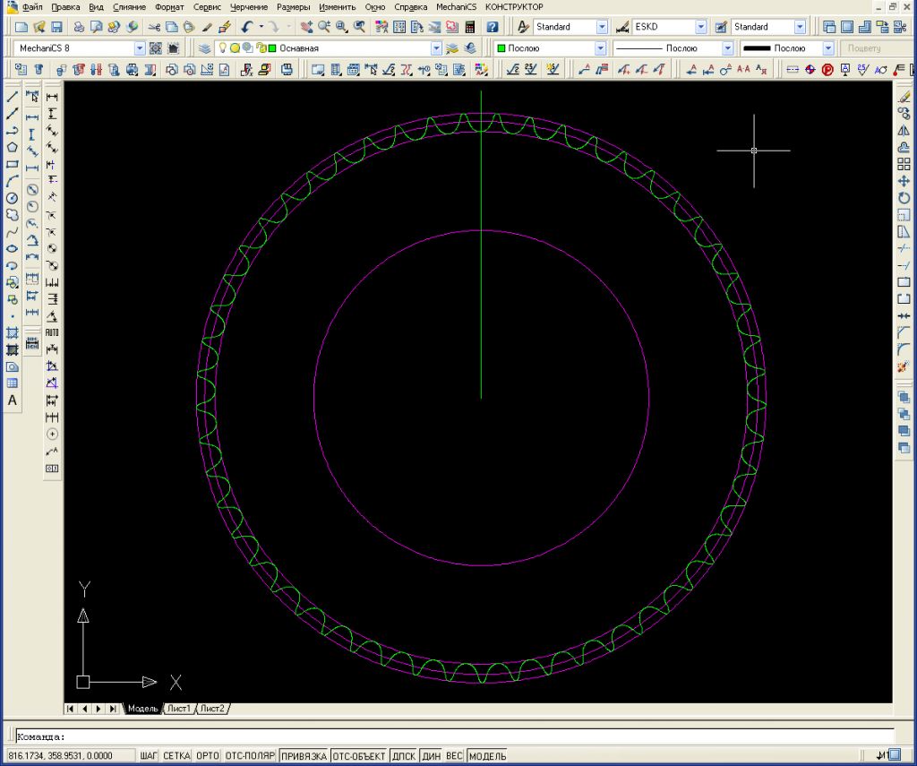 Как видно из расчета, разница в углах, образующих вершину зуба, минимальна. Плюс при попытке построения чертежа по этим размерам, приходится немного их их менять, так как образующие окружности, то не пересекаются, то наоборот пересекаются…