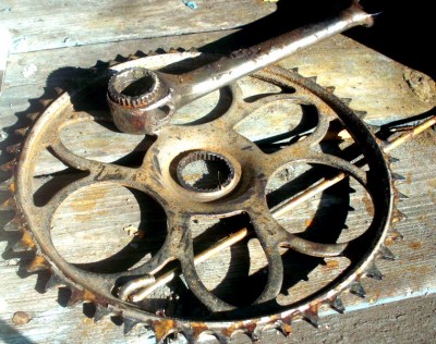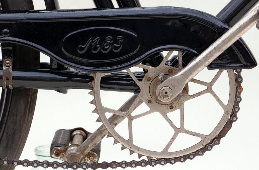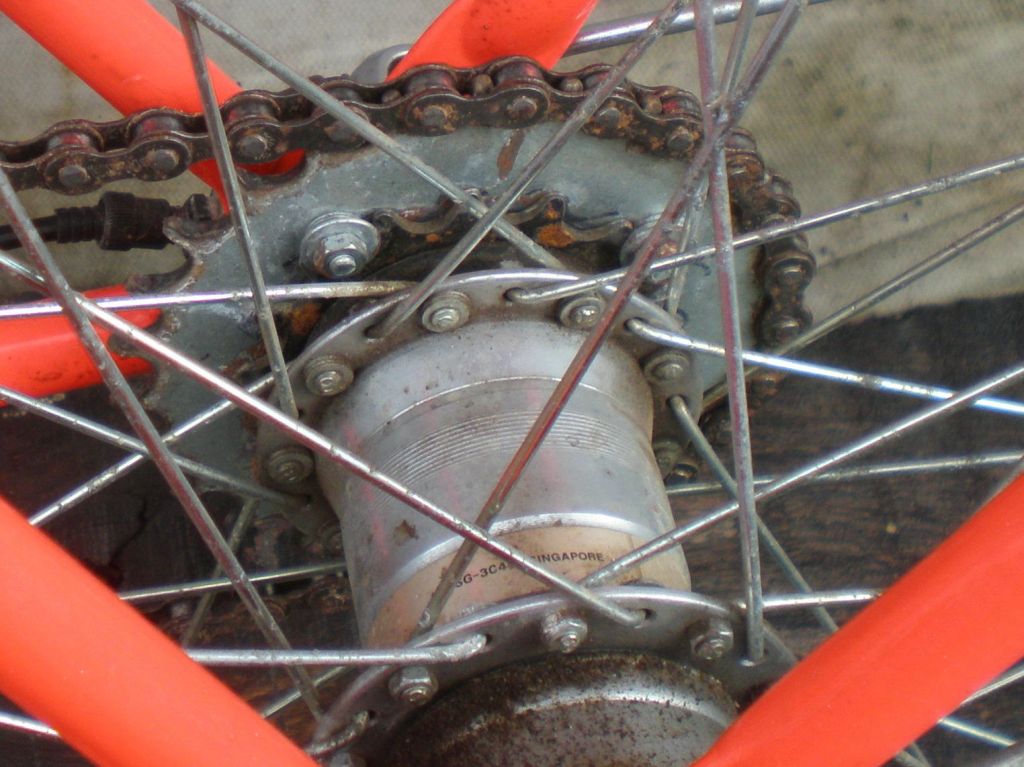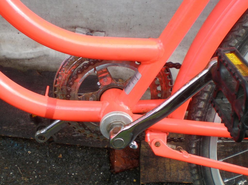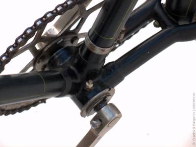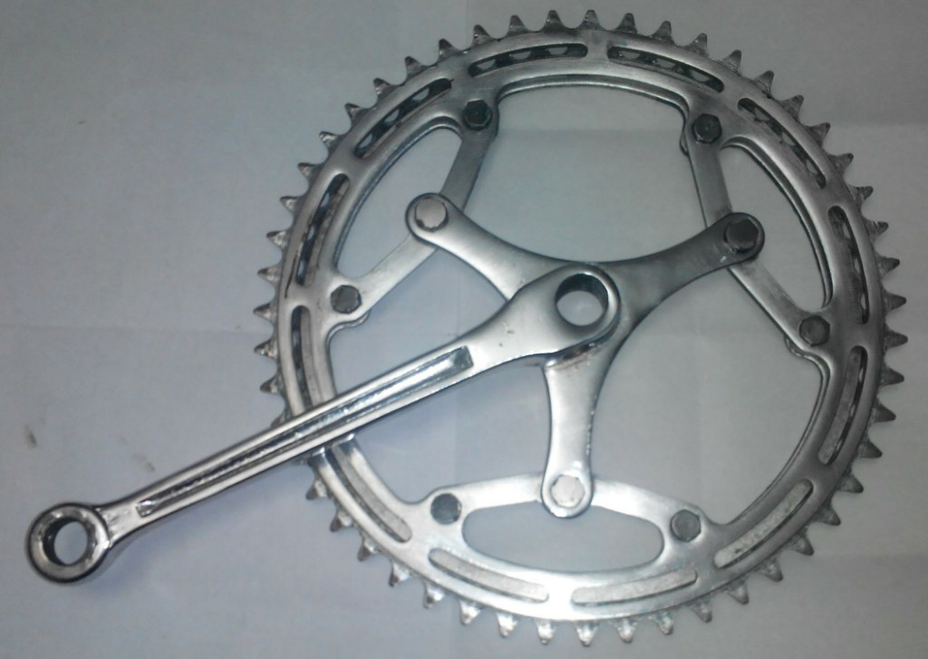 Впрочем, передачу 1:1 или близкую можно получить слесаркой и блестящую. Шатун от спортивных ХВЗ первой половины 70-х гг (т.н. малая пятилапка) вполне позволяет прикрутить довольно маленькую подходящую звезду. Вот здесь к ней прикручена чужая звезда, которая покрашена ради дизайна — могла и остаться хромированной: