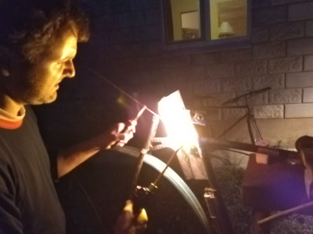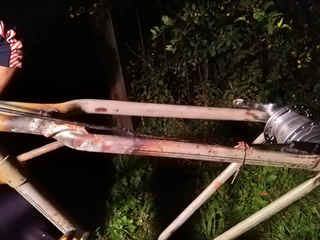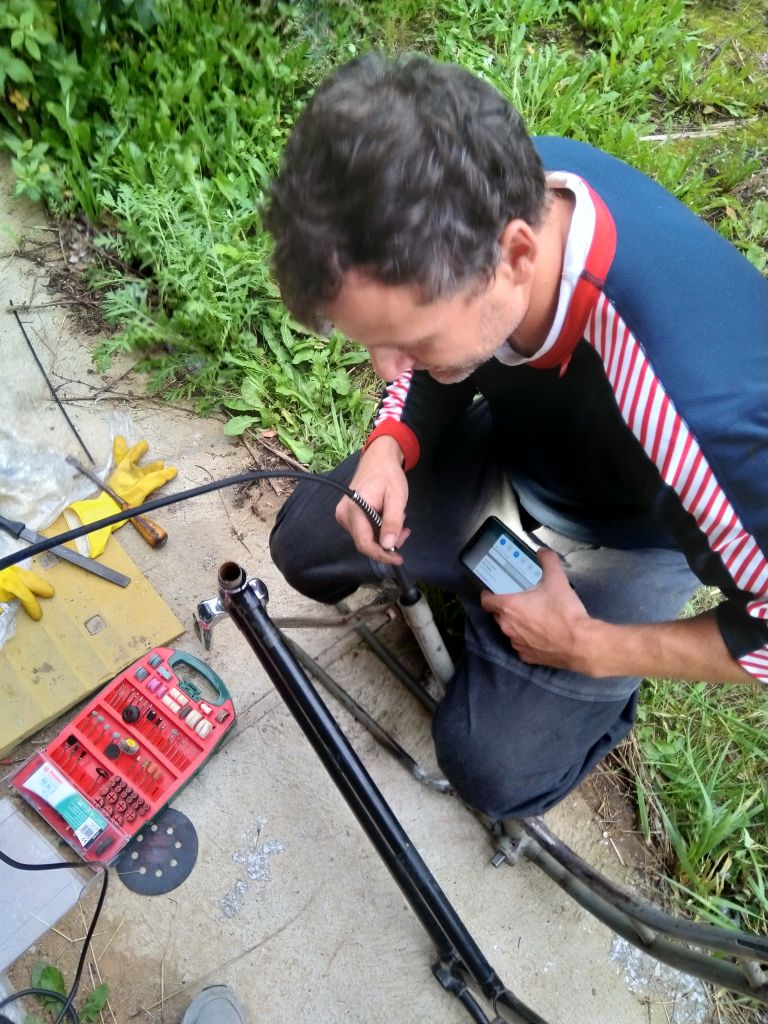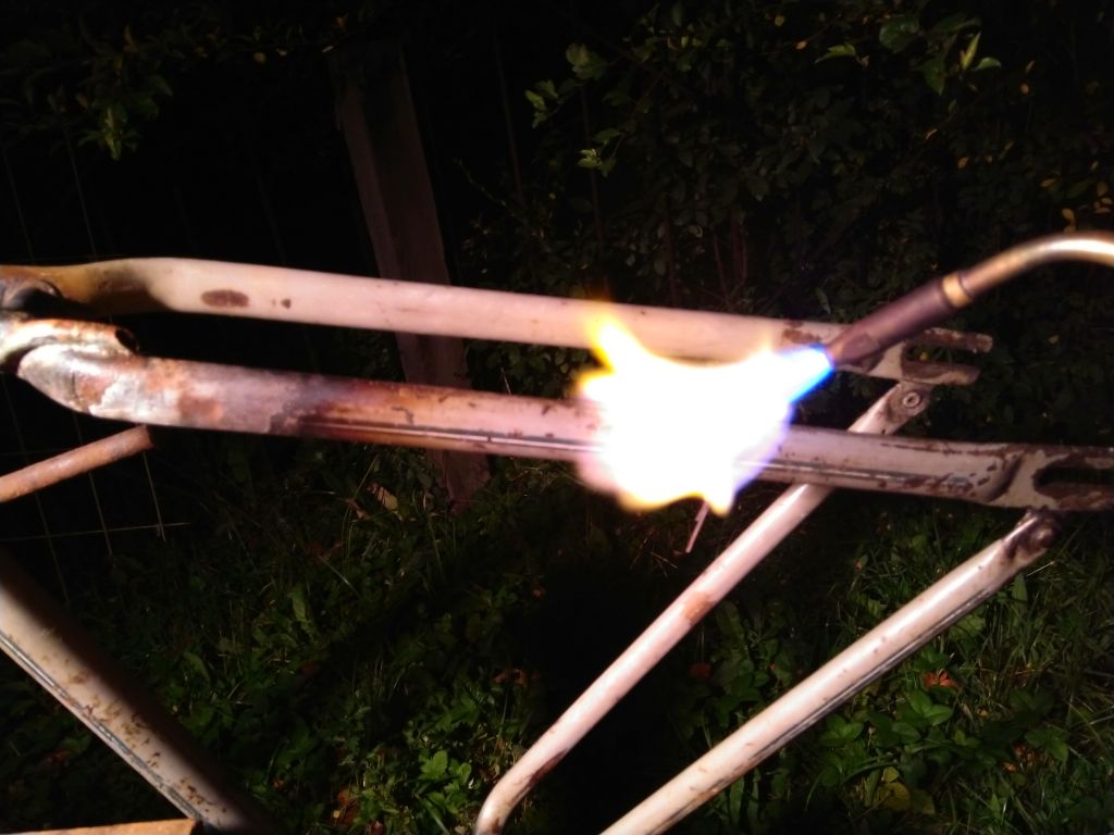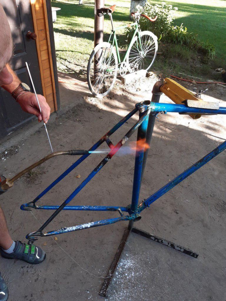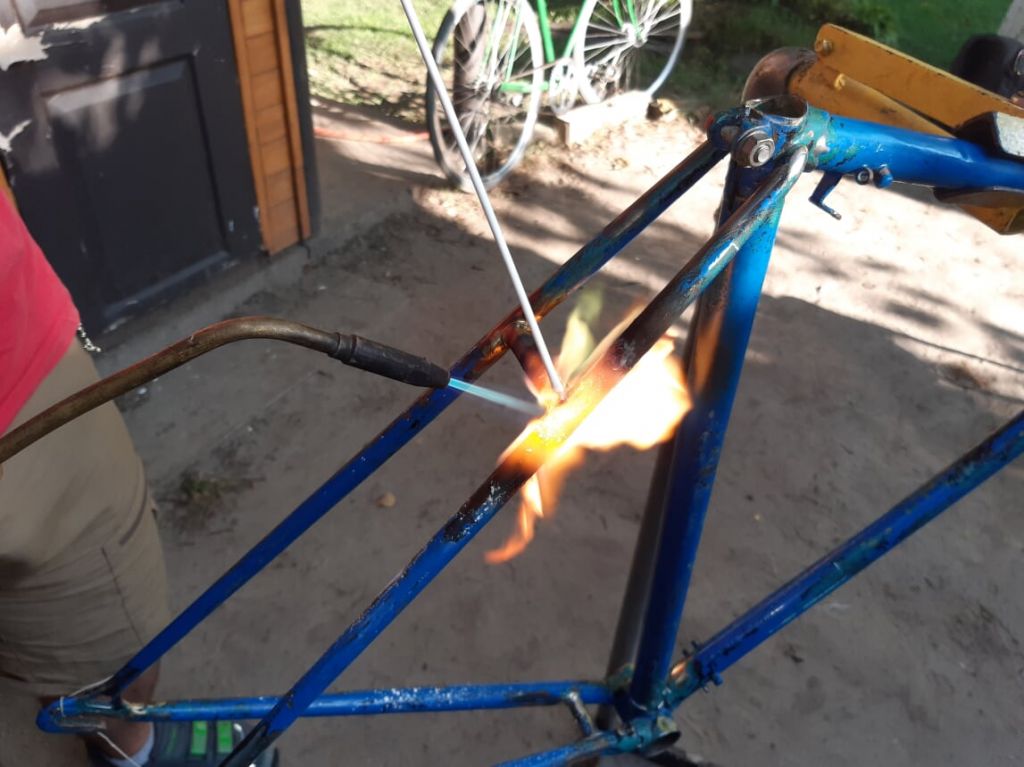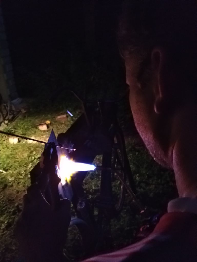 Пайка бонки под трос планетарки на раму немки (видна трубка-направляющая вдоль каретки из той же трубки и придумка Ильи с фиксацией бонки вязальной проволокой). Пялось серебром, т.к. медная бонка течет при температуре плавления латуни, как ни странно img/ab: