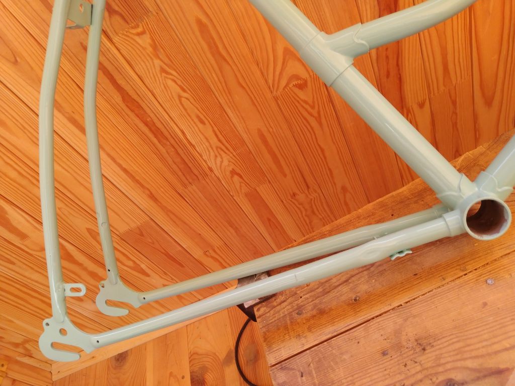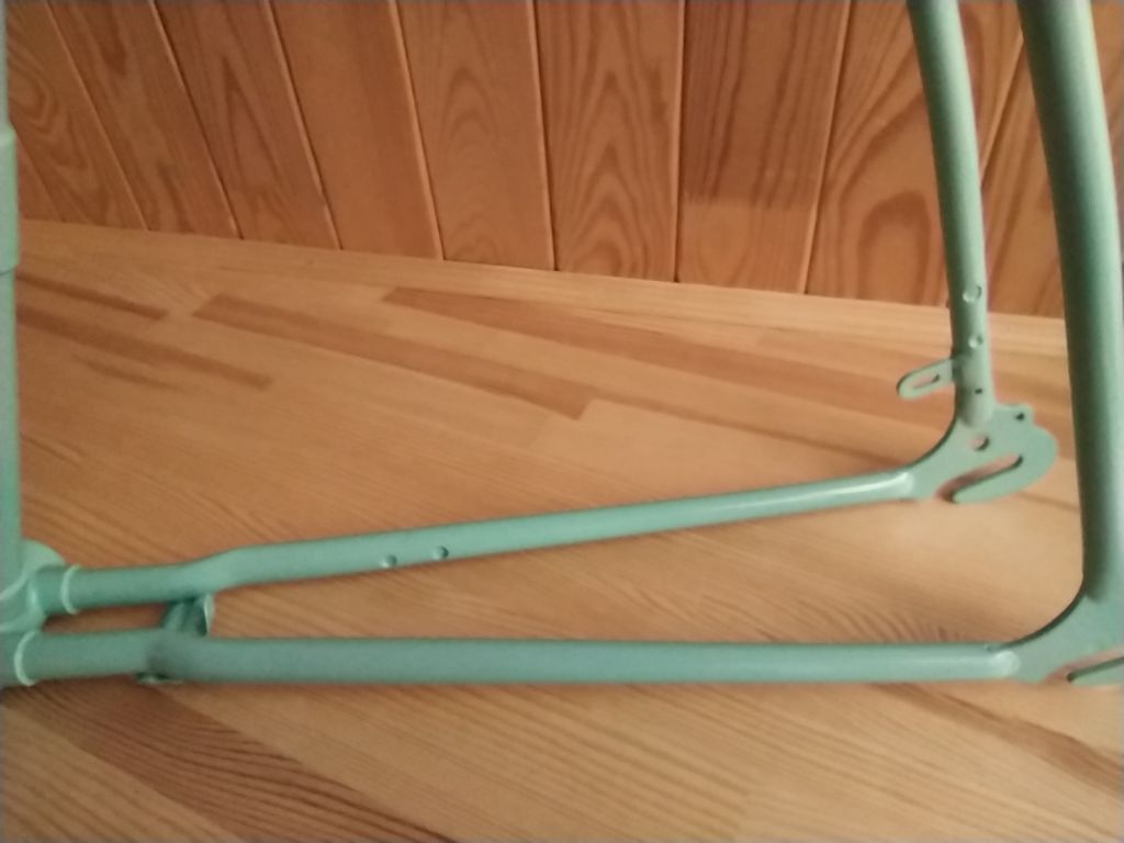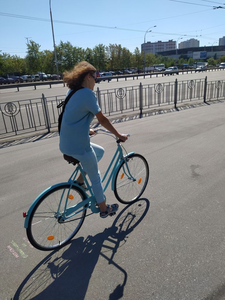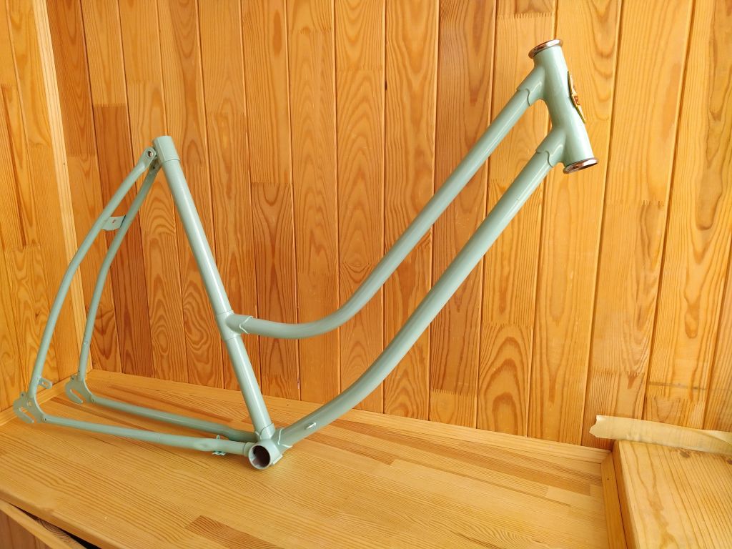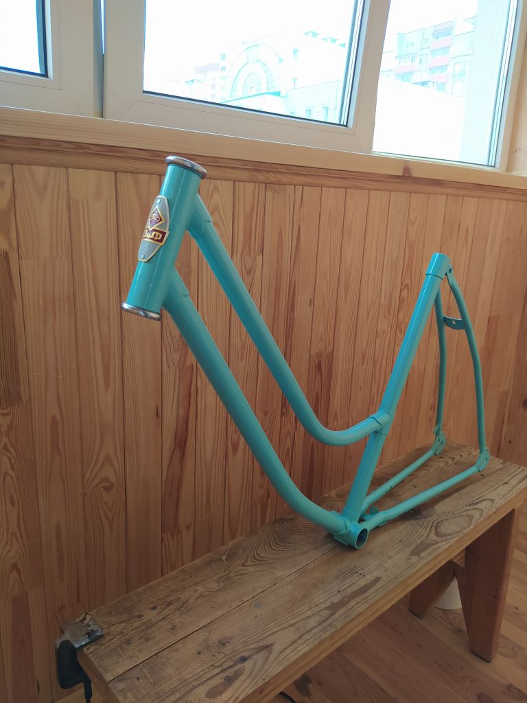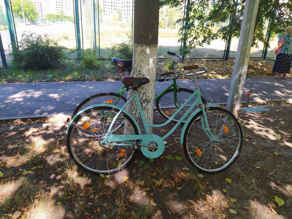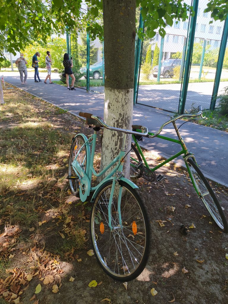 Как с тренажером- точно не будет)) Лето выдалось напряженное и все никак не выходило закончить велосипед. И вот свершилось. Вечером закатил велосипед в квартиру и первая шикарная реакция была на цвет. Потом в процессе отствойки положения седла были выражены сомнения по поводу формы и удобства руля и седла. А утром был пробный выезд...часа два, не меньше. Мои наблюдения со стороны: очень легкий и ненапряжный ход, что и было подтверждено словами хозяйки. Пока заезжали в лицей к сыну, успели словить комплимент от местного дедушки-охранника:" какие красивые и легкие велосипеды, они и ехать должны легко и быстро" Дальше ездили вокруг ипподрома и пару раз заезжали на базарчики. Радости жены не было предела)) Немного смущал меня гремящий щиток цепи, я поставил туда импровизированый успокоитель, но прийдется подклеить шумоизоляции. Было выражено пожелание иметь корзинку , только не на руле, а со стороны багажника. Чесно говоря, для меня установка багажника- небольшая проблемка, т.к. я пока слабо вижу, какой багажник туда станет без ущерба для концепции "легкости" . Для себя заметил, что подножка для парковки- очень нужная вещь. Если ее не поставить, то после нескольких парковок "к стенке" быстро появятся царапины, даже на порошковой покраске. Есть у меня некоторые претензии по внешнему виду, но они появились уже после сборки. Передня звезда от украины (в-134) не штампованая. как мне кажется она широковата для примовского щитка цепи. Но больше бросается в глаза то, что ее 5 кругляков в окошке щитка выглядят как непонятные лучи , идущие от шатуна. Красивее звучала бы цельная звезда(возможно, подищу что то более подходящее) Передний тормоз- родной примовский. Как оказалось, тормоза от дорожников не подходят совсем(большой рич) а тормоза от туриста слишком масивные. Надеюсь, подищу что то более изящное. Задний катафот импровизированый. Поставил на родное крепление, рассчитаное под советский кругляк, круглячек меньший. Сзаду выглядит не плохо, но со стороны выглядит как какой то торчак непонятный. Хочется что то "по щитку" Там хорошо выглядела бы "лодочка" от хвз. К сожалению, та, что есть у меня- с очень старой пластмаскою. На свежепокрашеной раме будет выглядеть неуместно. Есть и новодельная, но она совершенно не отражает свет(( И пожалуй главный вопрос на сегодня- багажник и корзинка. Буду искать какой то быстросьемный. Поездки на базарчик жена оценила, подозреваю, они станут регулярными)))