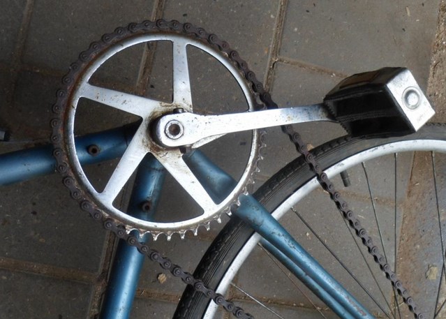 сле одного взмаха напильника под блеском проступила желтизна. Пришлось отказаться. Кстати родные примовские шатуны странные, у них посадочные под клинья сделаны в другую сторону. Выштамповка под шайбу и гайку с другой стороны. Педали поставил советские. качество хорошее, но по внешнему виду хочется что то поинтересней. Хотя вопрос педалей снимается в тот момент, когда на них становятся ноги))) Щиток цепи ограничивает варианты применения шатунов. Есть трехлапка, выглядела бы поизящнее, но затирает((( Соотношение звездочек 48х19