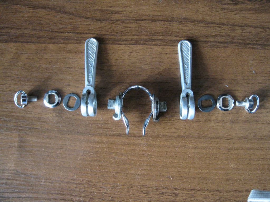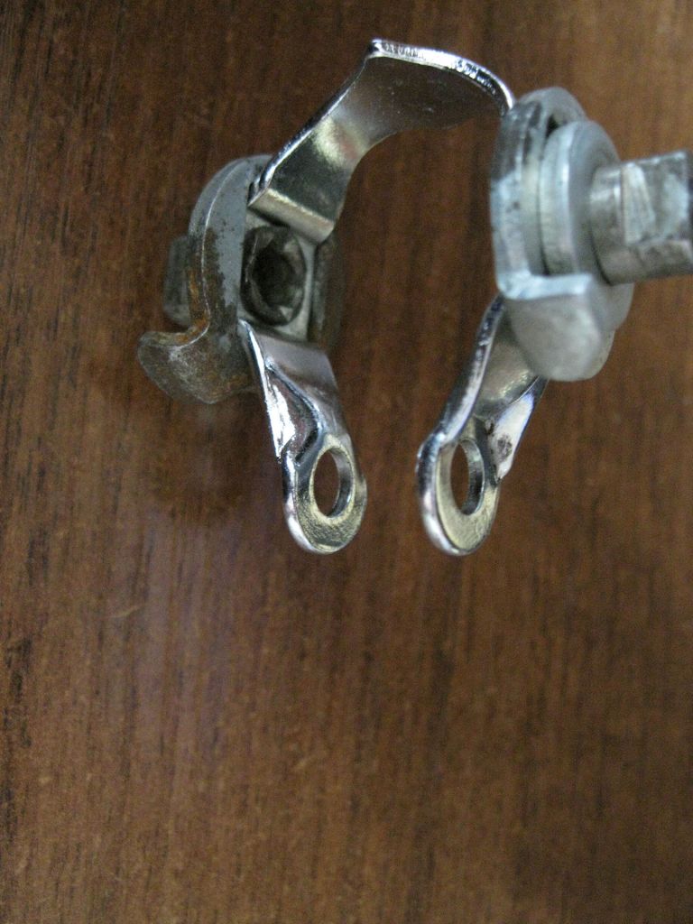 На моём 555 1974 года рычажки по форме привычные, но крупные, в сравнении с более "молодыми" выглядят как на Вашем фото. Почти симметричные, направляющая троса глубокая и узкая.