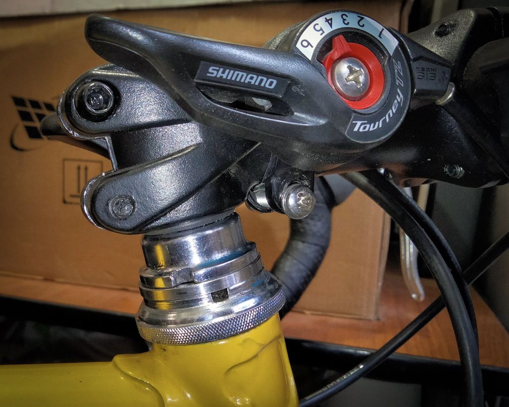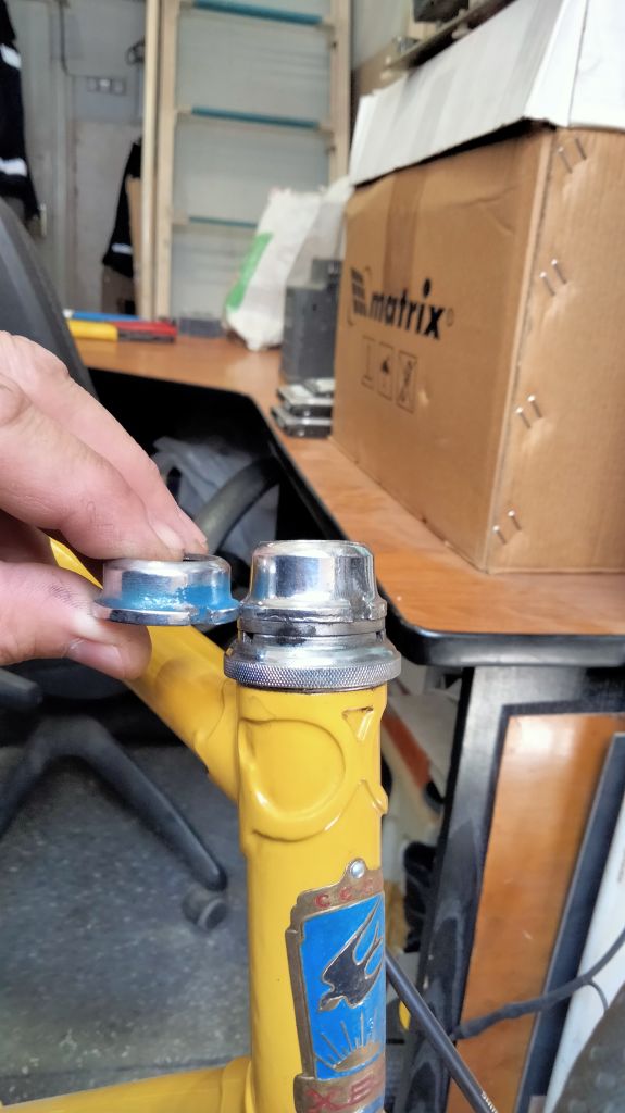 Кроме того, оказалось, что и контргайка верхнего рулевого подшипника у меня высокая стоит. Нашёл в хозяйстве ниже миллиметров на пять.