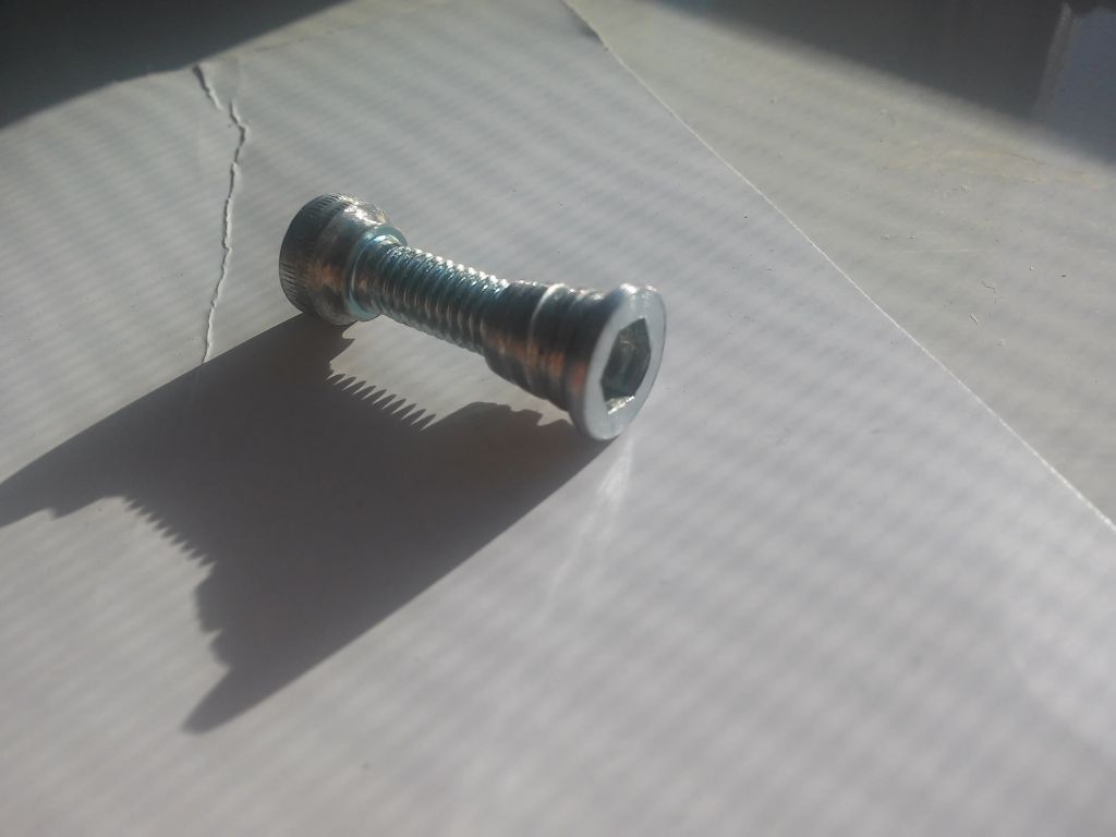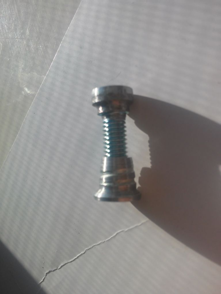 Болт напильник не берёт, и маркировка на нём есть соответствующая, сразу не разглядел. Сделал на шляпке болта диаметром 10 мм проточку диаметром 8 мм, методом зажатия болта в дрель, дрель вращается, а в руках болгарочкой аккуратно снимаю лишнее.