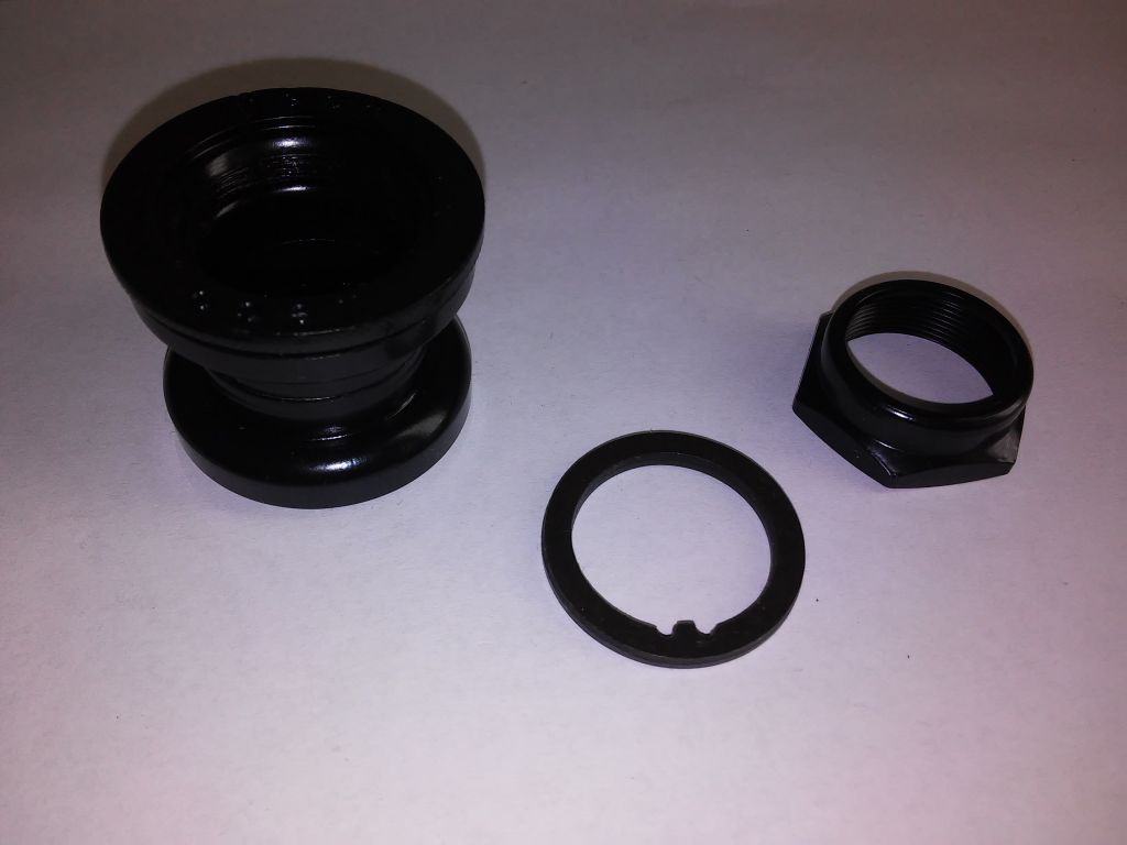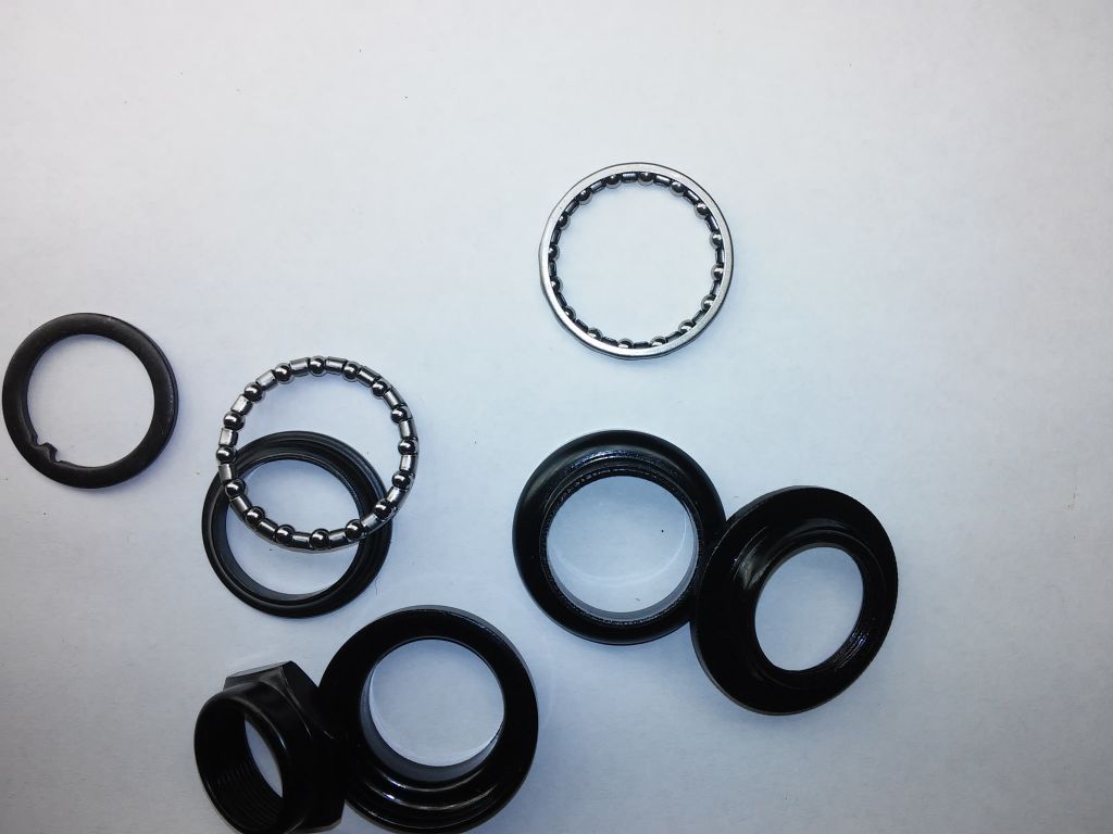 Нижний конус, к сожалению всё равно болтается на моей вилке, то есть, однозначно наплавлять и протачивать... Гайка и шайба на последнем фото почему-то как не из этого набора, шайба вообще не понятно как ставится... Как ни крутил, не подходят они по стилю, а шайба не лезет в мою стартоновскую вилку, возможно нужен будет напильник по вилке... Но всё сделано добротно и хорошо окрашено. Со стартоновской рулевой совместить наверное можно, но только вместо сепараторов вставив насыпь, сепаратор не ставится... Да и резьбу как то перерезать или перенакатать надо. Думал этой гайкой можно будет, но нет, гайка полуглухая как бы, в неё лезет вынос, но не проходит насквозь резьба вилки, диаметр гайки после резьбы уменьшается, легко туда можно вонзить пыльник.