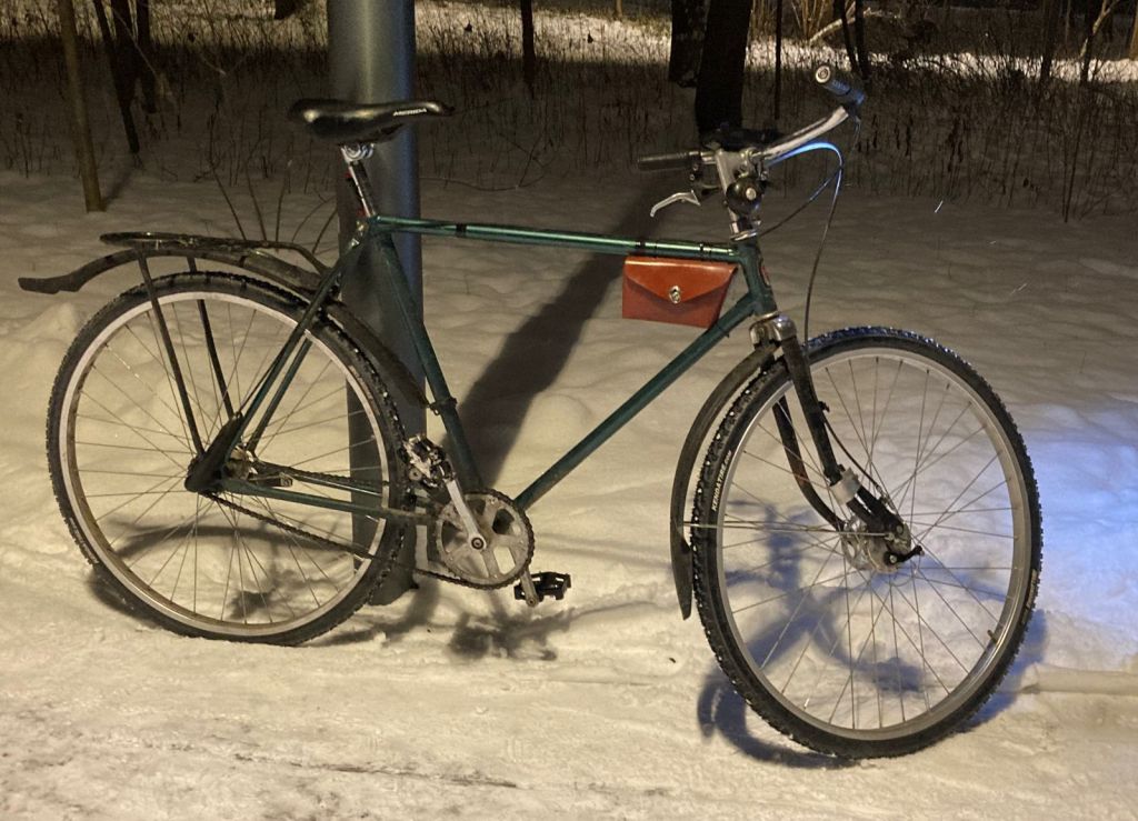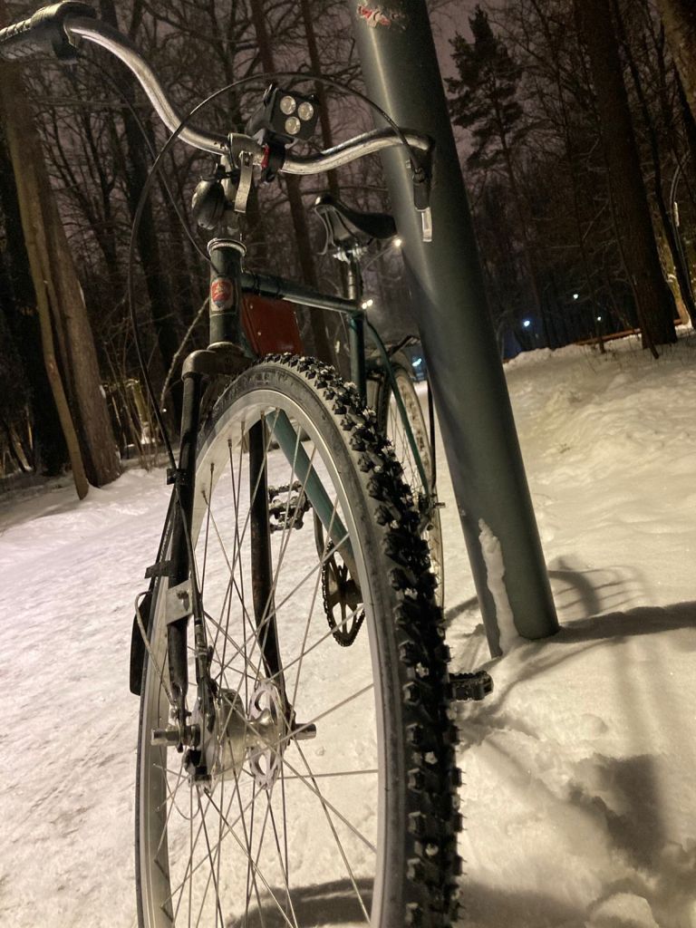 Вчера поставил велосипед на новые покрышки — шипованные. Не хотелось брать слишком широкие, дабы сохранить зазоры и чтоб покрышка лучше прорезала снег до твердой подложки. В итоге 37 ширина.