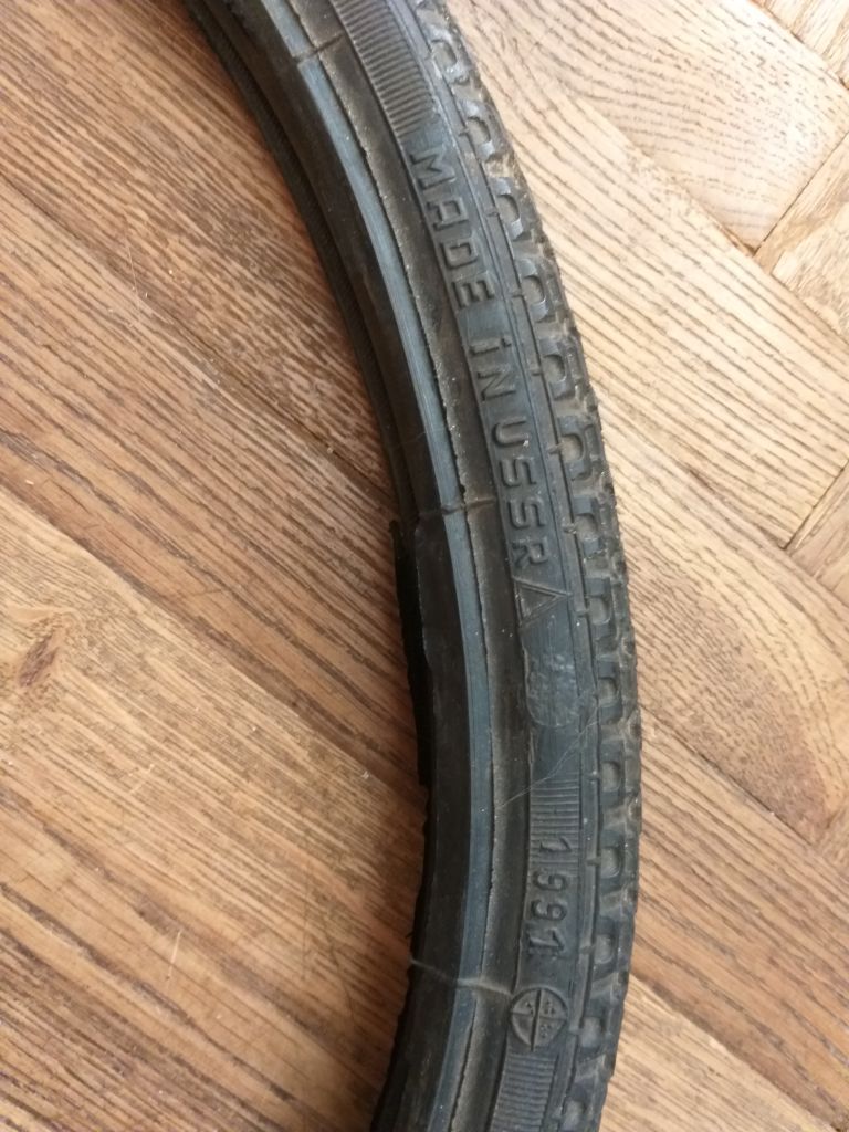 Но... оказалось что это старые советсские покрышки после треть векового хранения! Ну, то есть не в том смысле старые что б/у, нет — новые но "Made in USSR". За столько лет резина, конечно, потеряла свои свойства и ездить на таких по существу дела опасно.