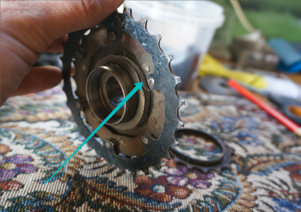 Ход моих мыслей и действий... Разобрал трещётку отвинчиваением против часовой стрелки первой малой звезды. Перед этим её резьбу (да, там есть резьба) пропшикал вэдэшкой. Зафиксировал трещётку на доске с помощью саморезов за самую большую звезду. Вариант один — накинул цель и что есть дури с упором ногами тянул... не вышло. Поэтому вариант второй: взял разводной ключ и не боясь повредить (и таки повредил) зубья малой звезды начал откручивать.. Поддалась! Малая звезда мне нужна только затем, что там есть резьба, и без неё никак, а так я звезду на 16 зубов не пользую на Туристе!