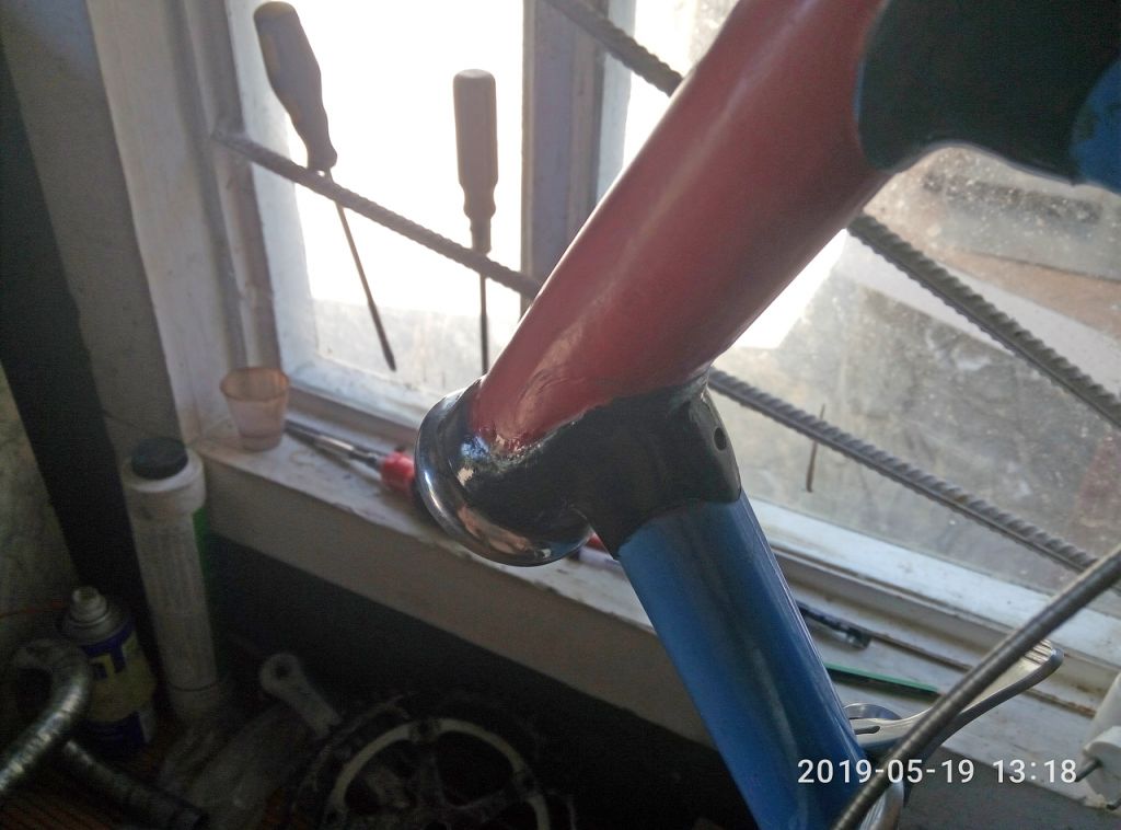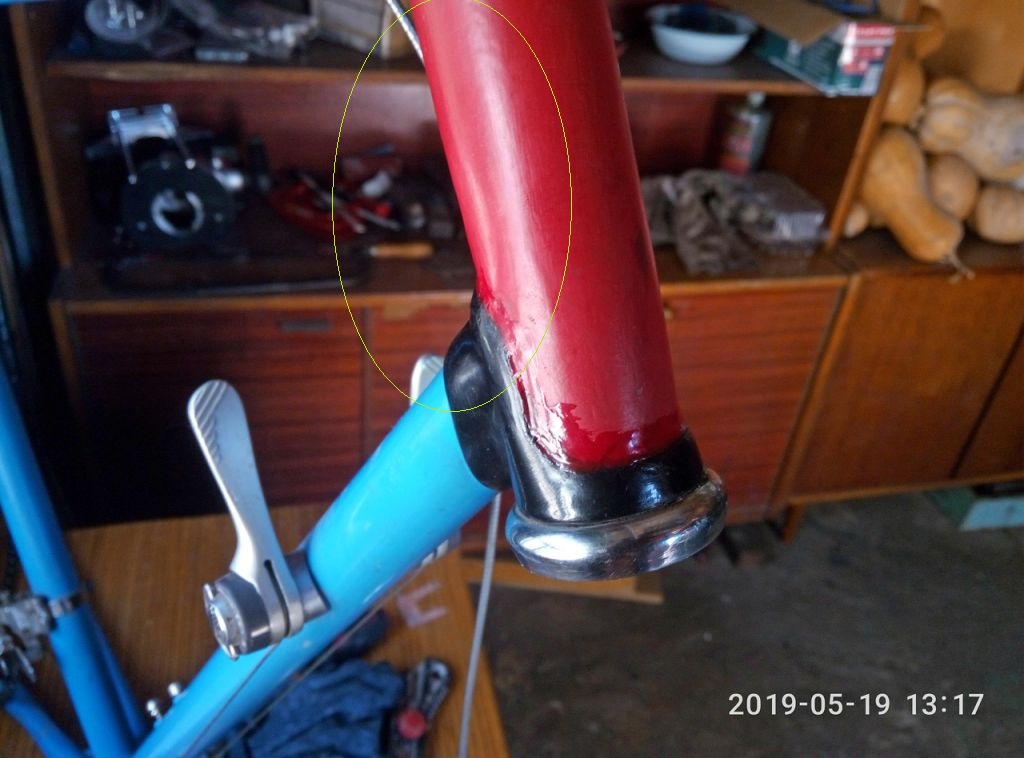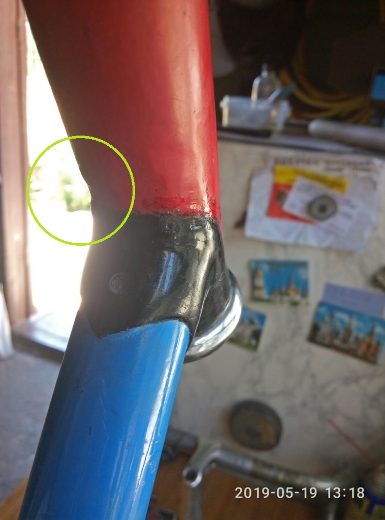 Улика_3. Вот это место меня приводит в ступор. Сперва я хотел всё зачистить от краски и этой залитой на вид эпоксидки, но потом подумал, а сделаю ли я лучше? Короче, шо маемо... Пичать всё это. Сейчас бы я не купил этот велик, лучше б переплатить пару тыщ и взял не аварийный. Никогда не покупайте велик на эмоциях!