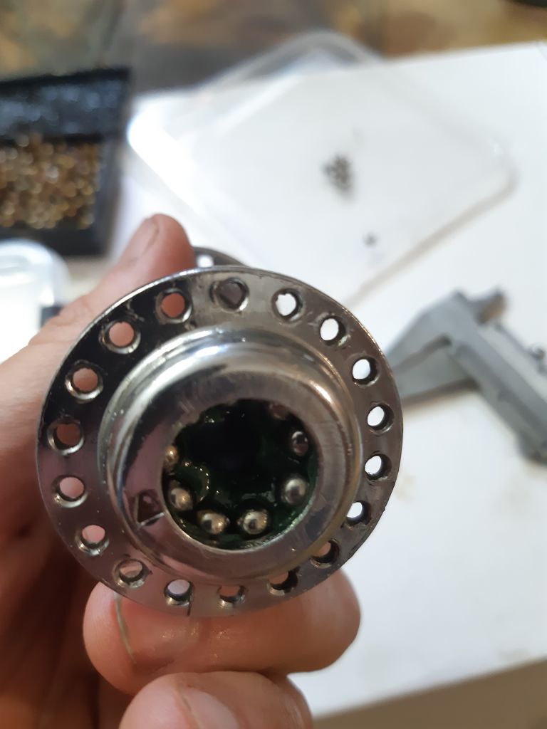 Из закромов родины были достаны подшипники 60х годов и такие же конуса Конуса оказались не той системы (на заднюю втулку), потому полирнул чутка родные. Промыл, откалибровал штангелем новую насыпь, собрал на ремонтной ХАДО.