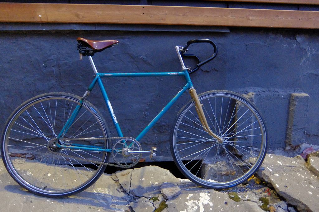 Конечно,понимаю,что такие велосипеды не редкость.Интересно,какого года этот экземпляр.Номер рамы 01556,больше никаких цифр я не нашел.Под заборной краской кое-где проступают линовки,светло-зеленая и желтая полоса.Седло — валенок на пружинах,с невообразимым глаголом причудливой формы: