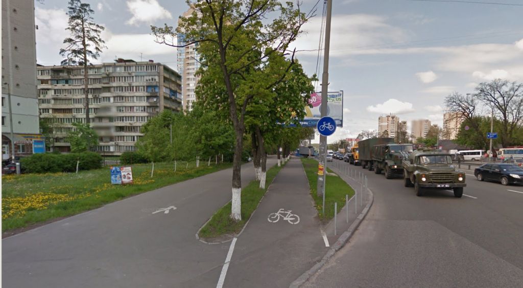 2. Вдоль проспекта Бажана (Харьковский массив) — параллельно тротуару, рядом с ним. Это классная трасса в промежутках между станциями метро, но возле них тротуар и велодорожка сливаются в одно целое.