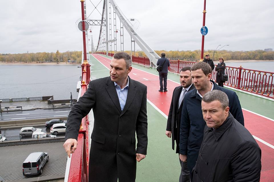 1. С Троещины в центр через Труханов остров, Парковый (пешеходный) мост и Владимирскую горку. От Троещины до Московского моста по тротуару, тупо разделенному пополам; по острову — за счет дороги (там машинам проезд ограничен и максималка 20 км/ч), но по тем же велодорожкам бегает много бегунов; пешеходный мост недавно отремонтировали и разделили цветом на вело- и пешеходную зоны. Правда, наши урбанисты на это решение плюются, уже не помню, почему.
