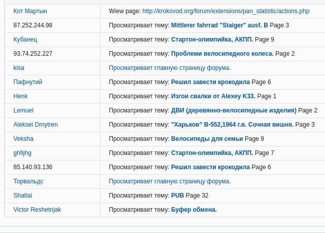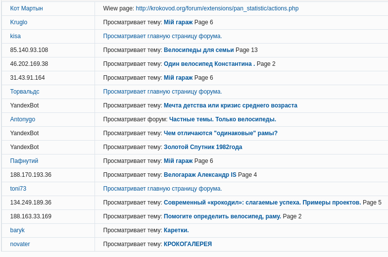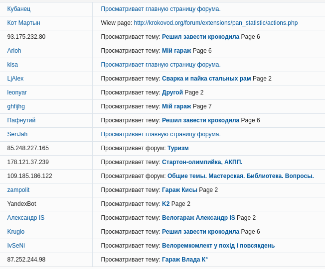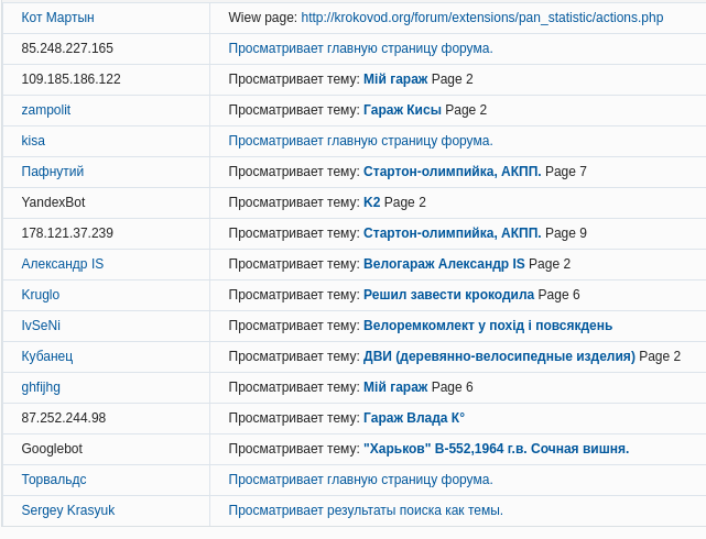 Другое радует. Вот эта информация, которую все мы видим внизу каждой темы — типа кто её сейчас просматривает — в админке ещё и сводится в одну таблицу, чтоб видеть картину по форуму. Ну, понятно, IP гостей ещё выдаёт, а не просто "гость". Я уже показывал её.