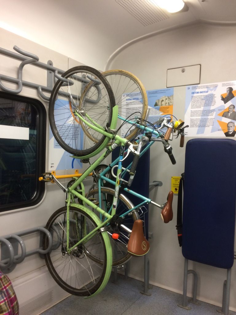 Odyssey, с августа 2016 года, все новые электрические поезда, выходящие с завода, в обязательном порядке имеют в головных вагонах места для размещения велосипедов. На сегодняшний день, около полутора сотен таких электропоездов работает на московском узле, остальные разбросаны по сети. Выглядит это, как-то так: