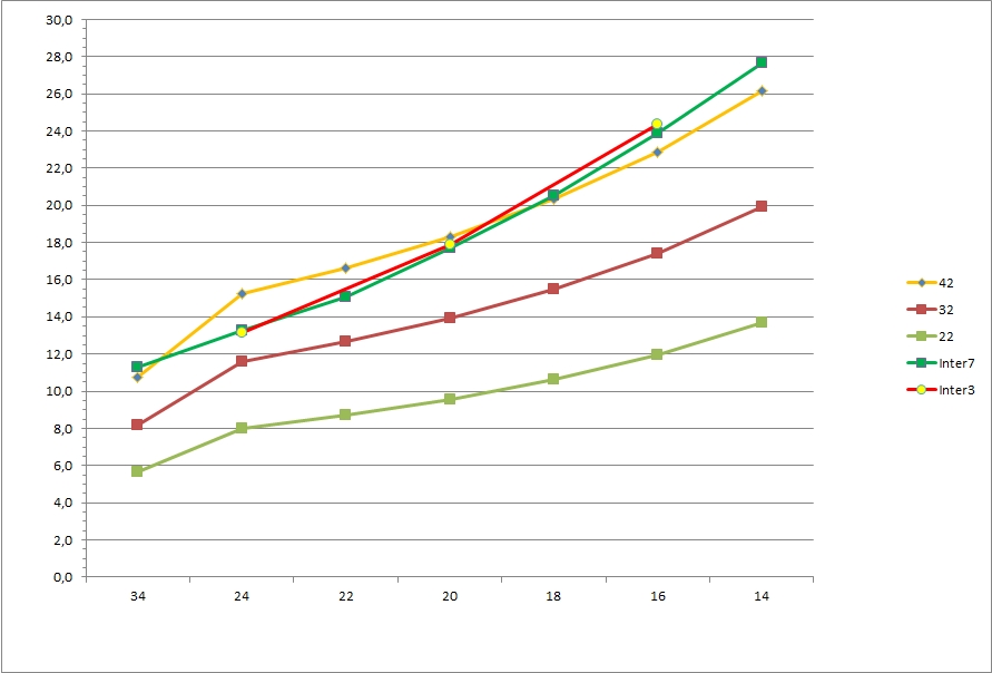 Получается теперь, что при одинаковых скоростях вращения педалей (70 об/мин) мой дорожник на семиступке быстрее стелса жены на её текущем наборе звёзд  img/be И это я ещё со своей Inter3 перекинул звезду на 22 зуба, а так то в комплекте на 21 зуб шла звезда. А жена у меня вообще на 32й спереди всё время ездиет, лишь переключая задний набор.
