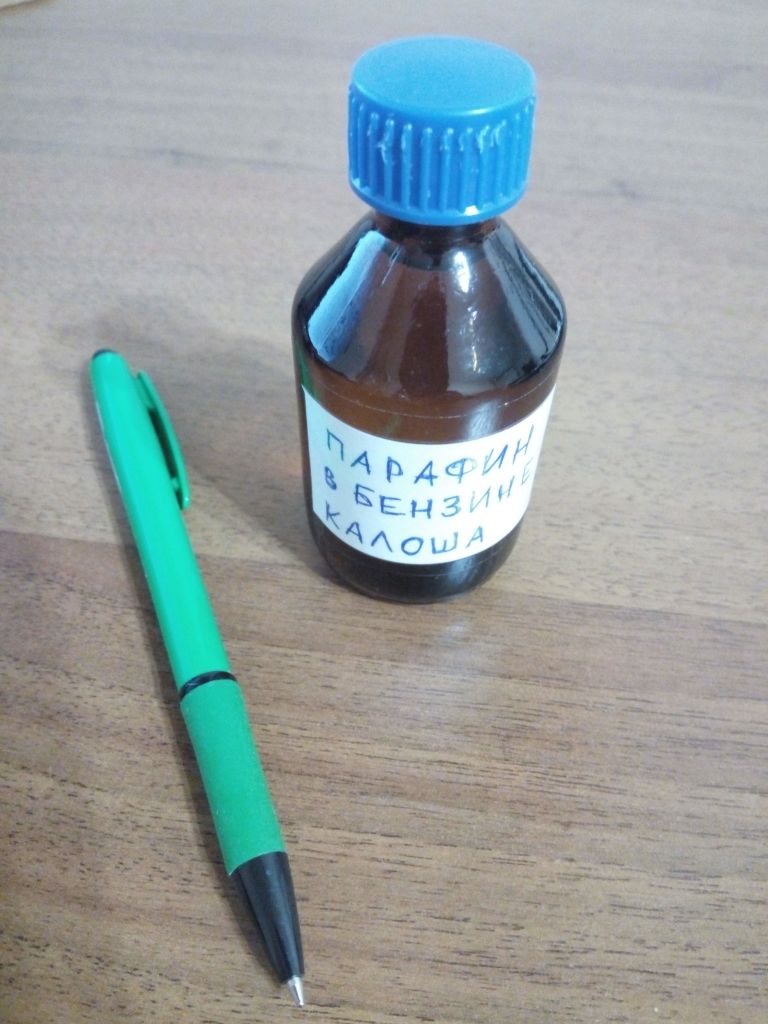 Парафина накрошил туда почти половину (рыхлыми кусками) и все за несколько часов растворилось. Значит, сыпать половину, доливать бензин Калоша не полностью, если растворилось совсем — добавить парафину, чтобы раствор насыщеннее