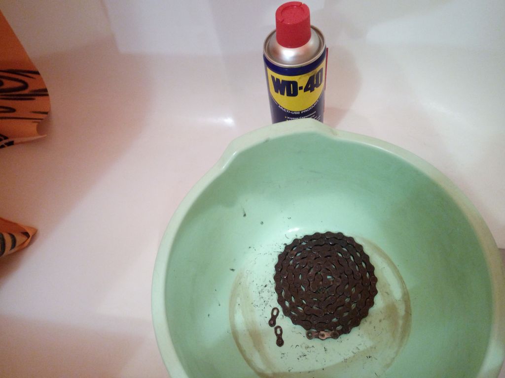 Т.е. обрызгать, оставить на пару минут, омыть цепь водой и положить сбоку на пару черновиков (дабы не слишком загрязнять ванную поверхность). Смыть из тазика жирную грязь с маслянной ВД-шкой в унитаз, смыть водой/рукой сколько получится.