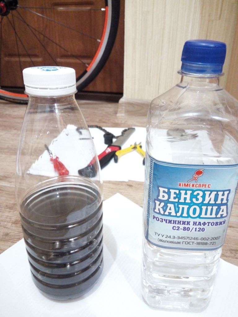 После того, как цепь духов покажется внешне чистой, следует очищать её внутреннюю сущность. Полоскать в бутылке с бензином Калоша. Который от, казалось бы, чистой цепи мгновенно становится черным. Серой стала только 3-я порция, пошло более 0,5 Л