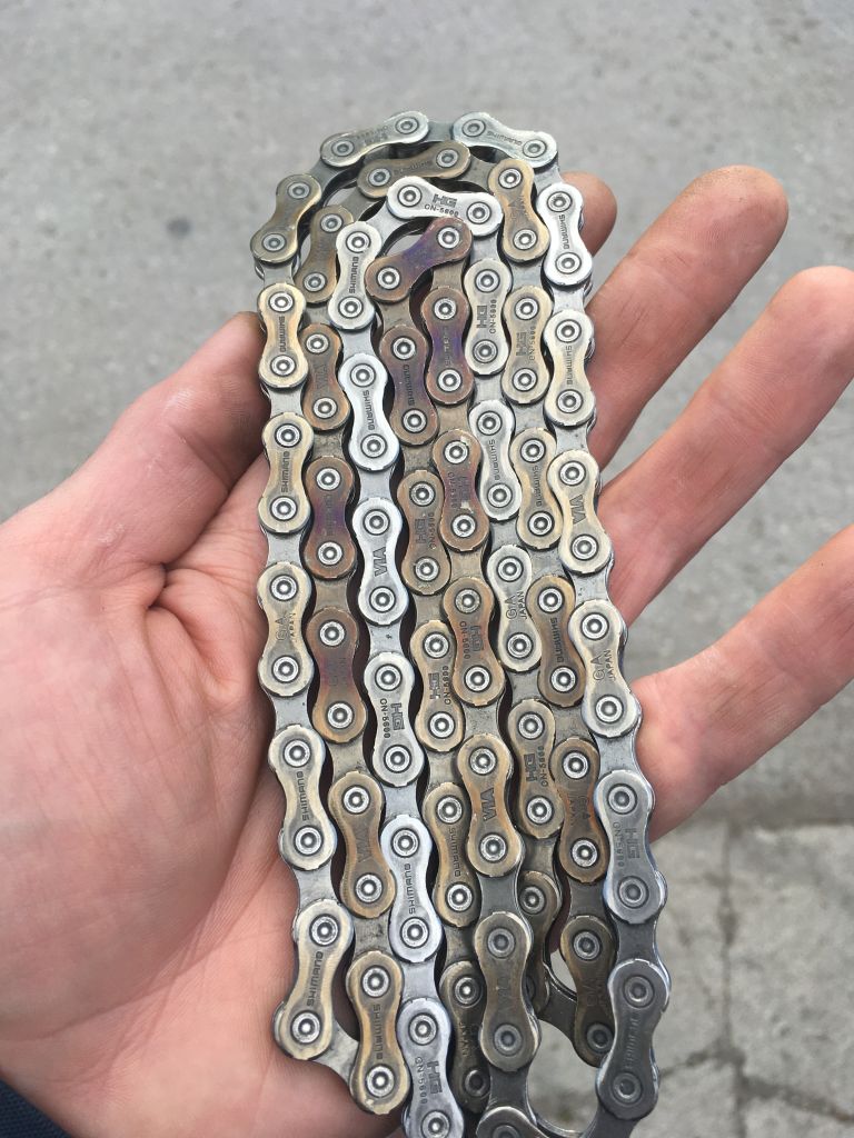 В условиях воздействия противогололедных химических реагентов на основе хлоридов зимняя цепь обречена и живёт недолго, как танк в атаке. На зимний вел ставлю цепь с износом 30-60%, смазываю обильно каждый месяц трансмиссионным маслом и принимаю меры к защите одежды от загрязнения (щиток цепи или чехол из гофротрубки). После окончания зимнего сезона снимаю цепь и брезгливо выбрасываю убираю на хранение, чтобы сделать из неё потом сувениры.