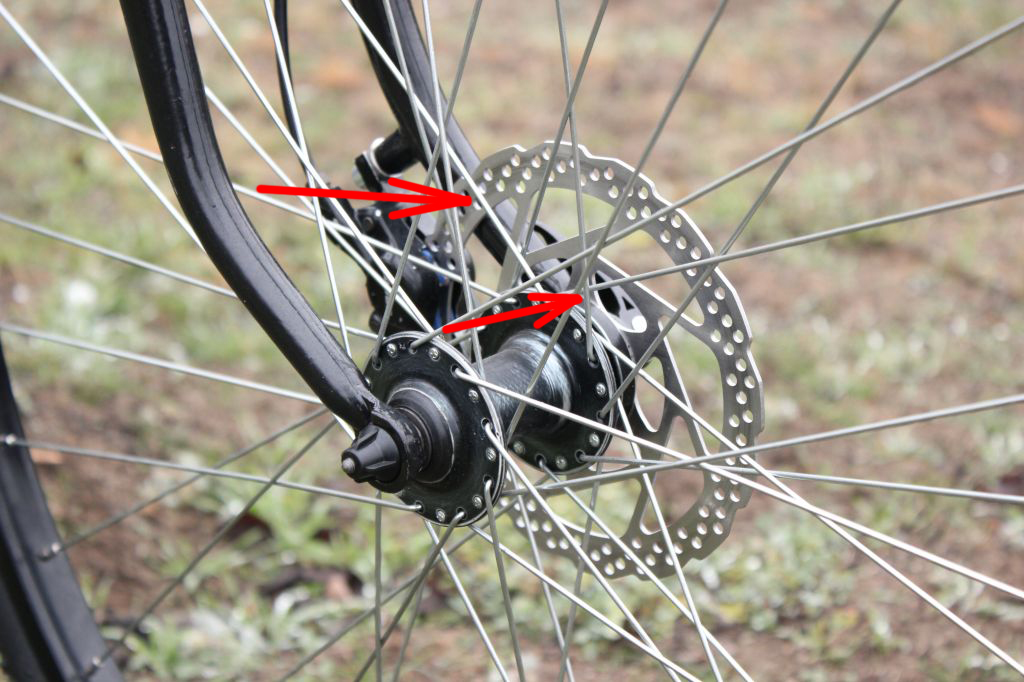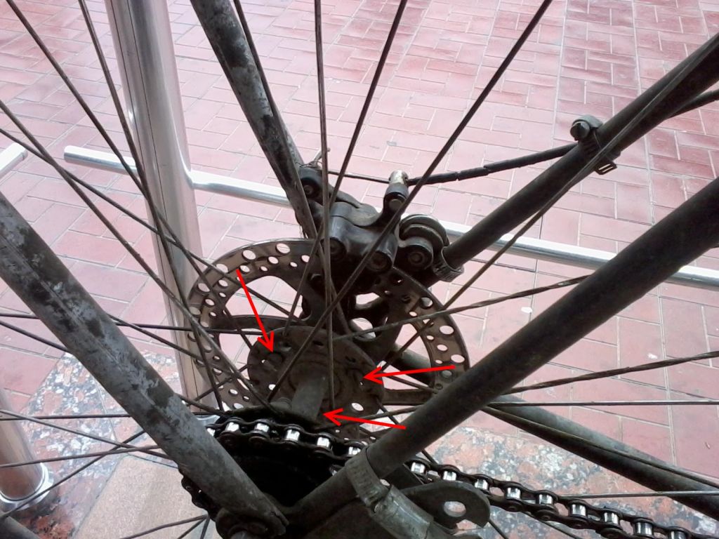 Оказалось нужно ноги вилки сделать как ноги у ковбоя, что только с коня слез. Или вмять само перо в двух местах. От края диска к дропам, примерно 20-30 мм и в месте крепления диска к втулке. Болты не проходят.