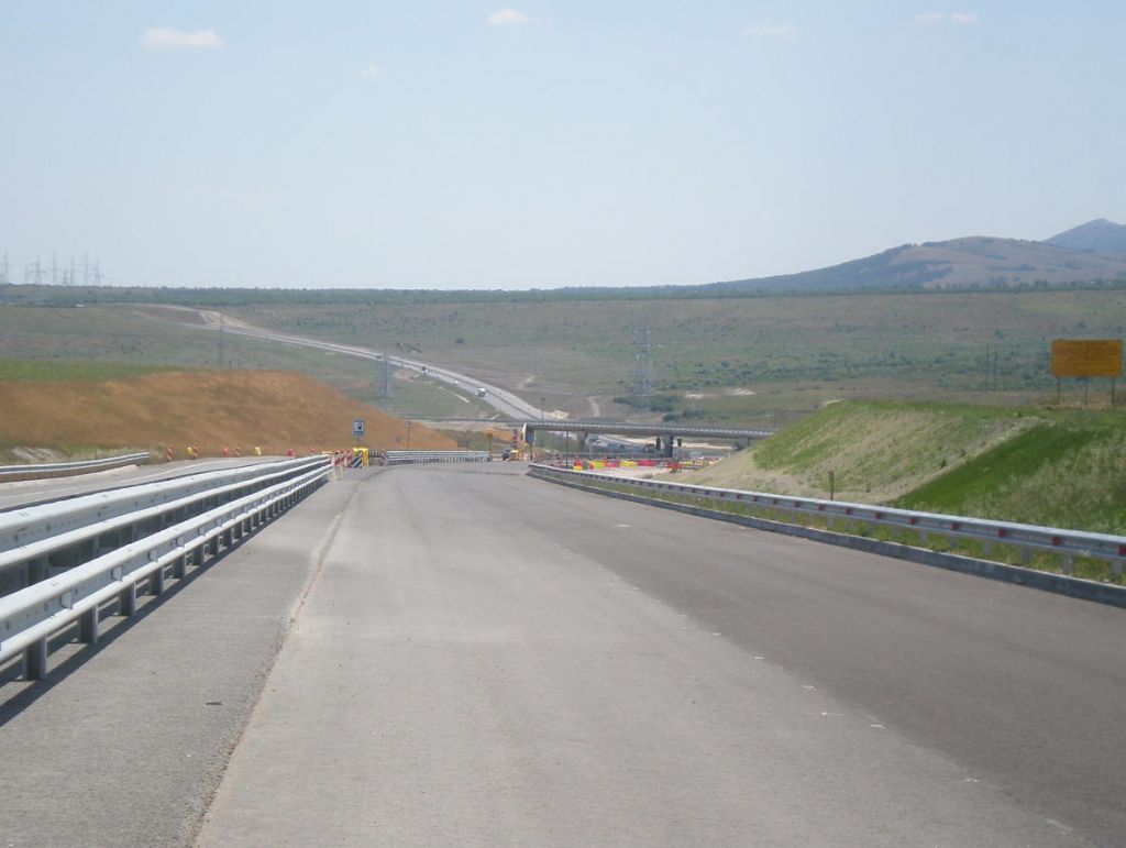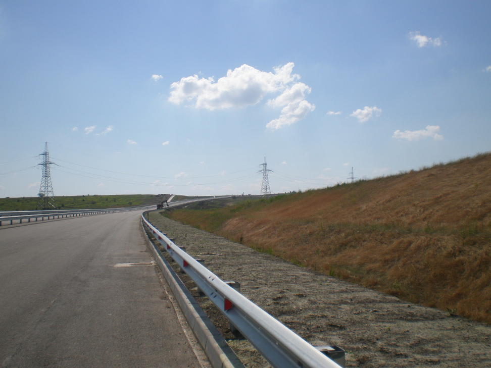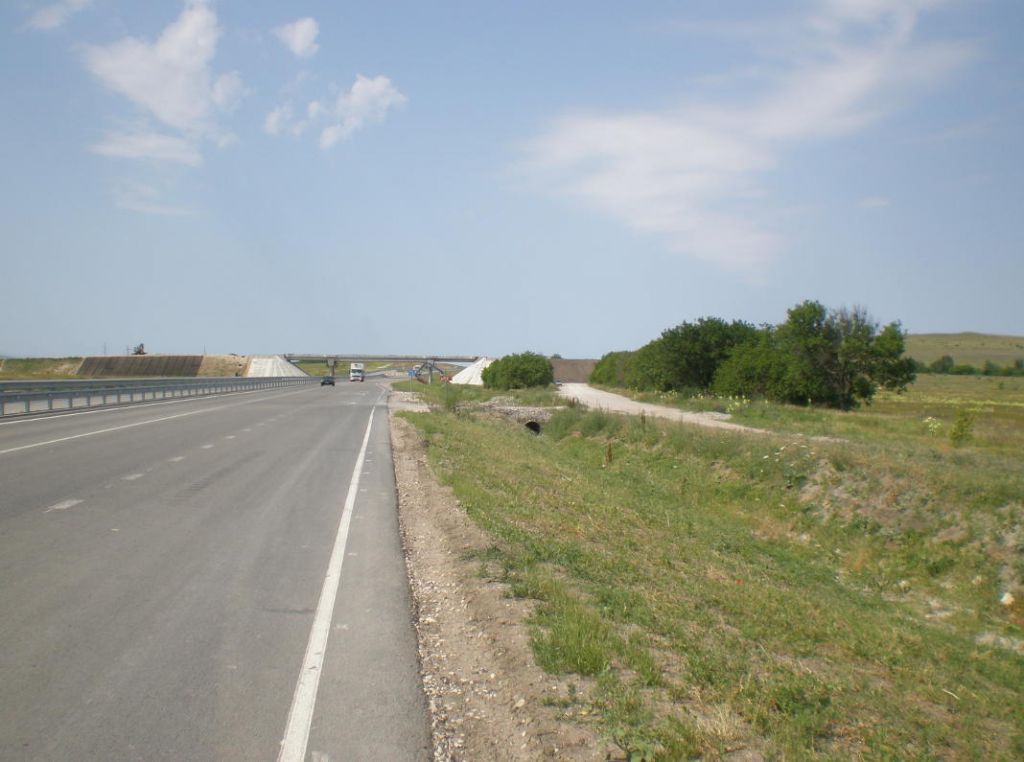Покатил дальше. Движение по новой дороге не очень значительное — впрочем, и по старой дороге Керчь-Симферополь когда я по ней ездил тоже не сплошной поток был, пробки только около Симферополя. Очень часто на дороге нет ни одной машины от горизонта до горизонта. Снимок назад, в сторону Белогорска — тут заканчивается одно из мест раздвоения дороги: