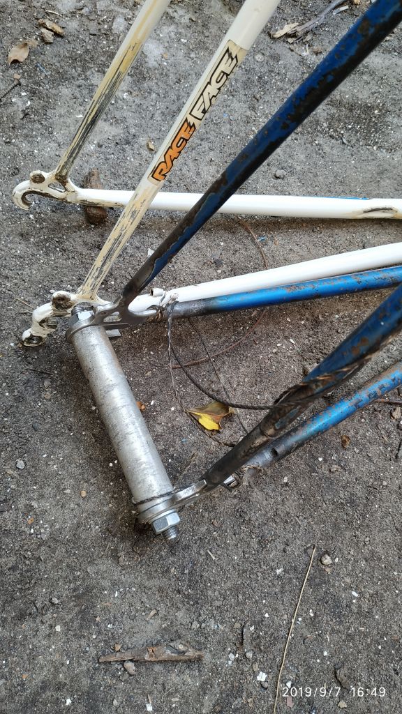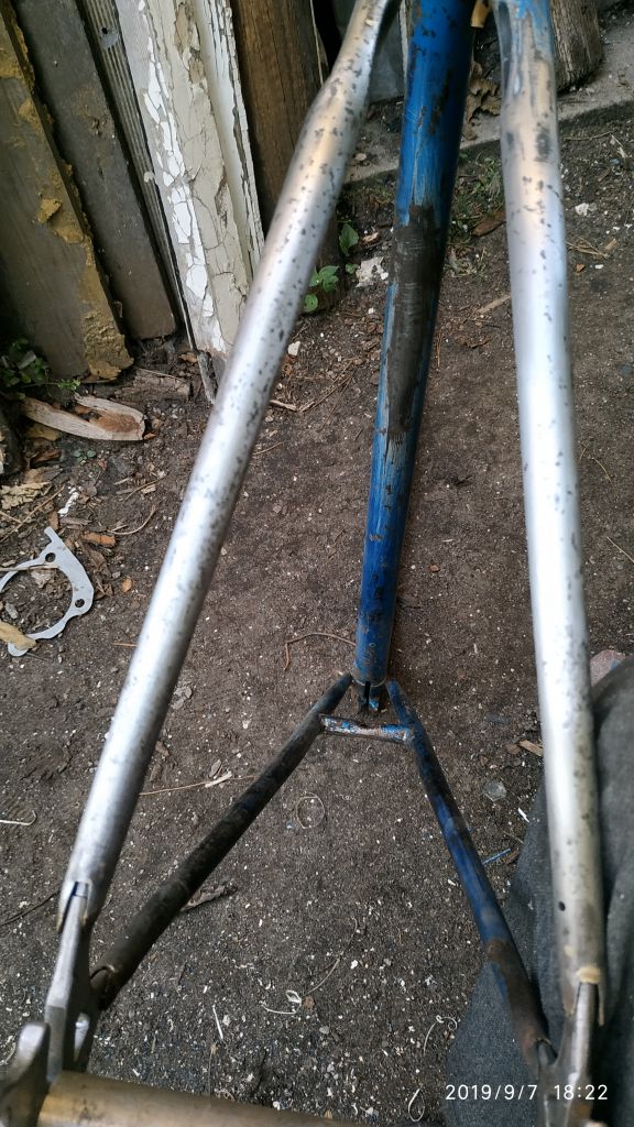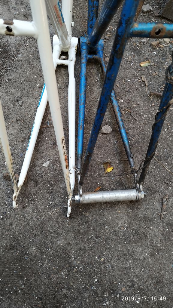 Ну что ж, "лед тронулся — господа ....", сегодня думал попаять, но сосед не смог. По этому начались подготовительные работы перед пайкой — снятие краски и оценки что имеется. Первым делом поставил две рамы рядом, на фото видно на сколько длинее задний треугольник у "одесситки" (белая, битая рама из Одессы, о ней было выше) по сравнению с олимпийкой (синяя, видавшая виды)