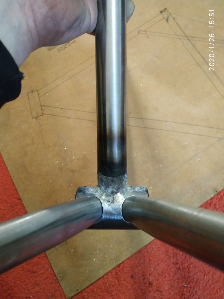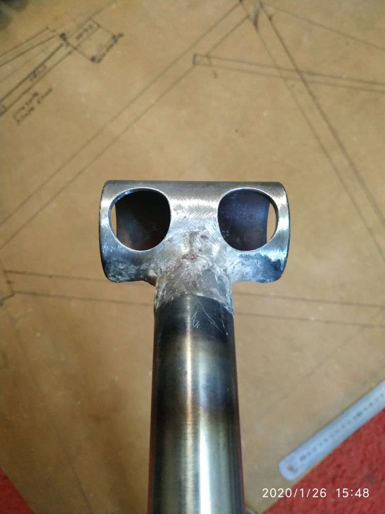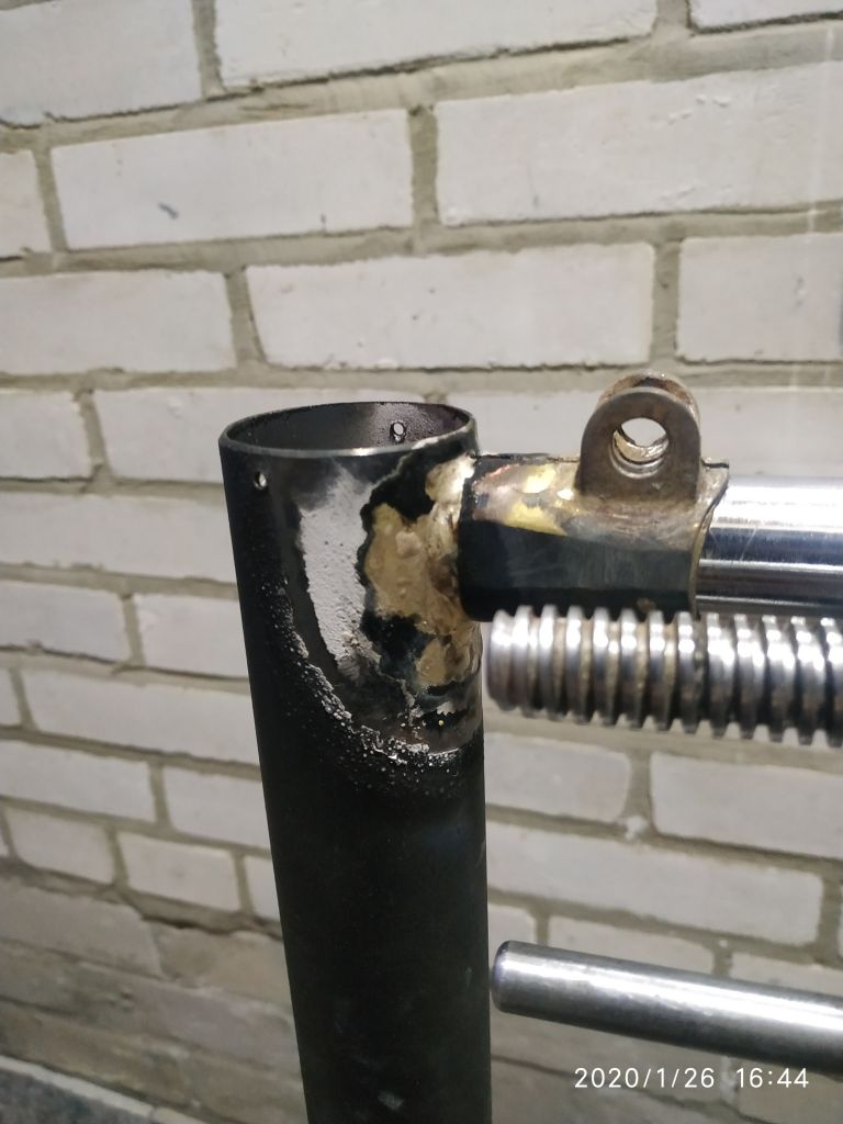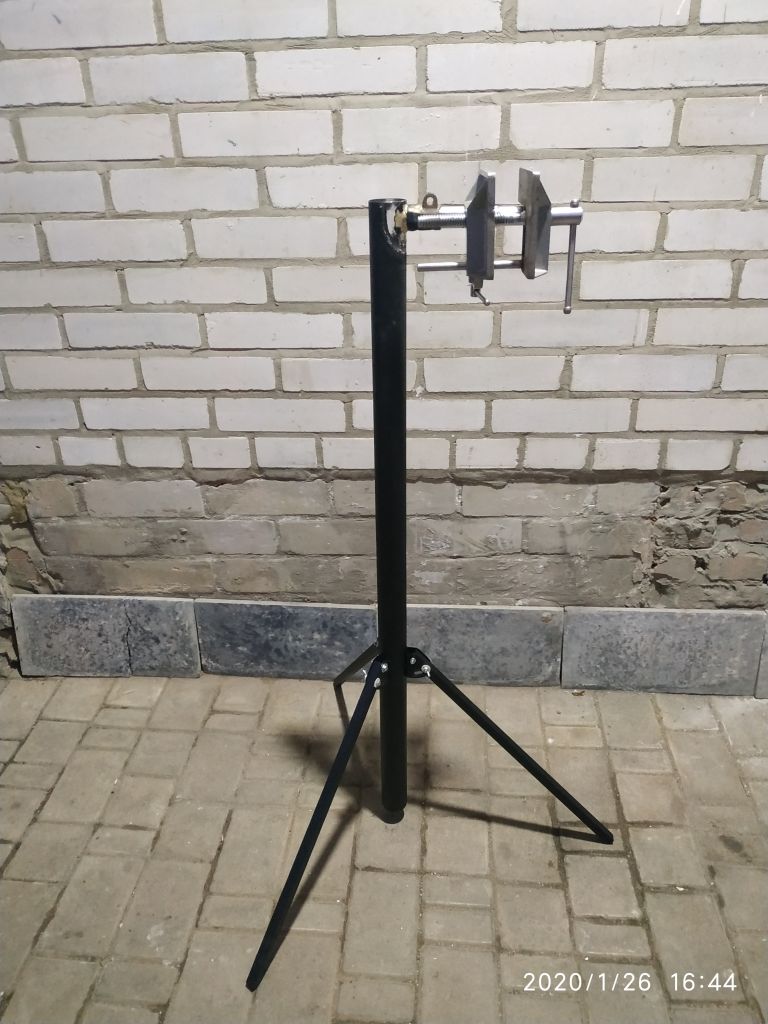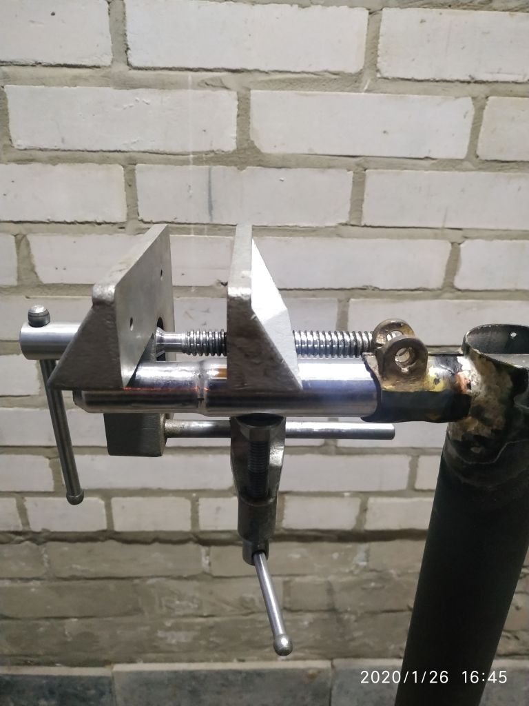 Сегодня решил усовершенствовать стойку. Не хватало полноценного вращения в вертикальной плоскости. Для этого отрезал кусок подседельной трубы с зажимом от старой рамы, просверлил главную трубу и впаял этот кусок. Ну и внутрь хвзшый подседел. К нему уже прикрепил тиски .