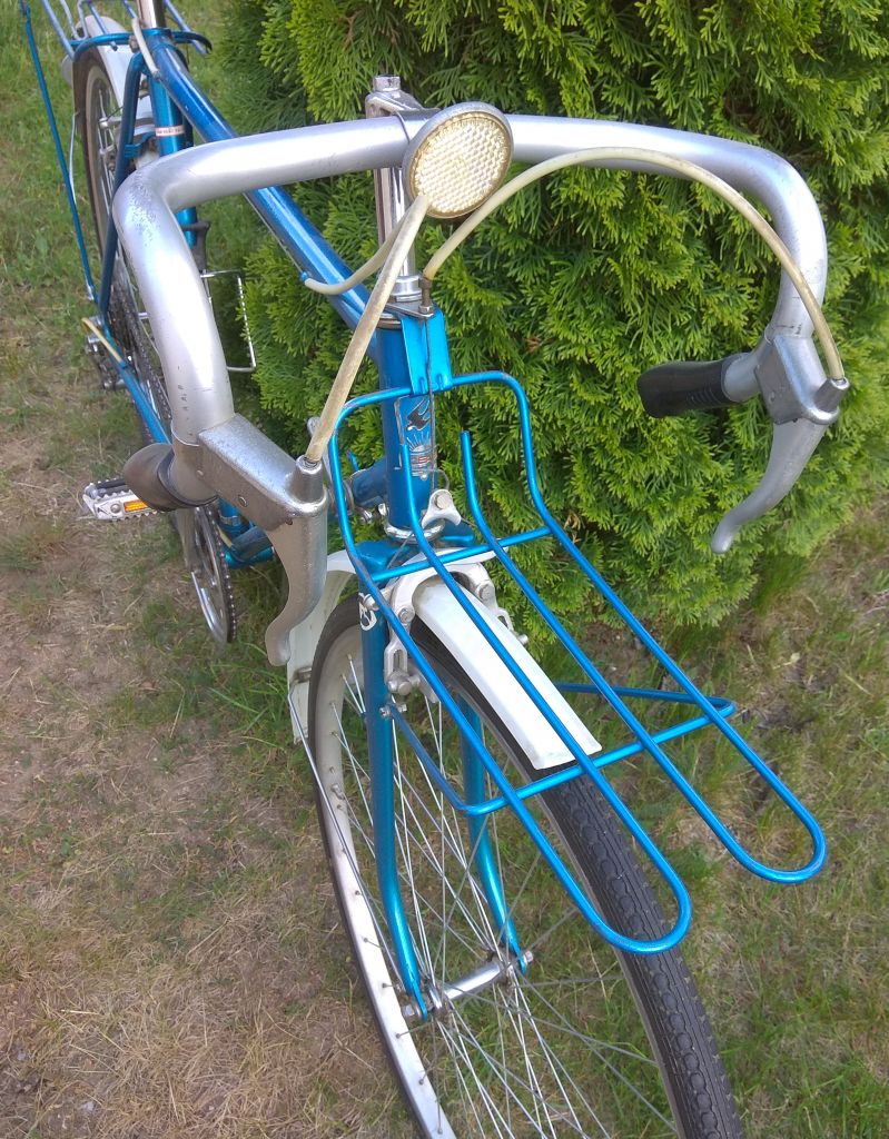 На отцовском В-301 1974г. был передний проволочный багажник с завода, в цвет рамы — вишневый. Помнится, он был чуть короче заднего и без прищепки.