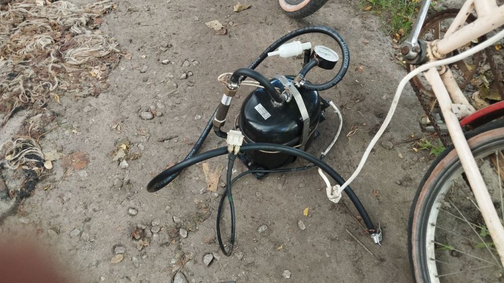 Маслоотделитель — сантехнический сгон 1/2" с двумя штуцерами 1/2" х 8 мм. Внутри набита металлическая мочалка для посуды. Расположен так, чтобы задержанное масло стекало обратно в компрессор.