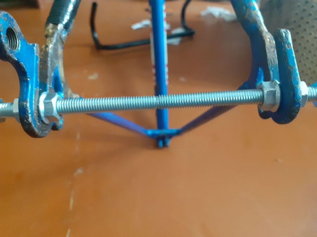 Проверил паралельность дропаутов с помощью шпилек М8. На вилке они были немного кривыми, выровнял перья руками. На задних дропах все было нормально, и правка не потребовалась
