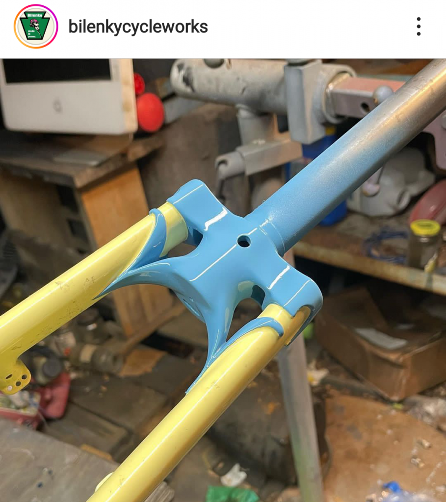В меленькоколісника дуже довгий рульовий стакан, непропорційно. Думаю це спроба вирівняти пропорції. Цей чолов'яга не перероблює, а паяє з нових труб.