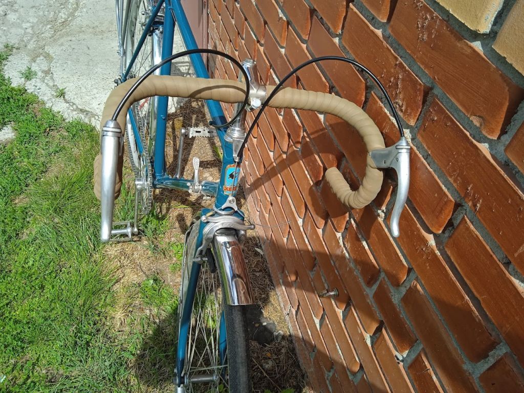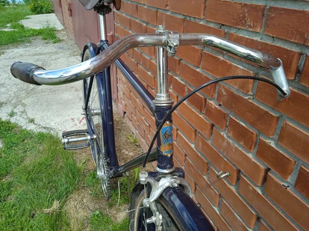 На велосипед установлен широкий руль от Старт-Шоссе. Рама крашена порошком в цвет RAL5020  плюс сверху слой лака. Хромированные крылья позже мне дослал продавец этой заготовки. Он когда отправлял мне заготовку совсем про них забыл, потом нашел и оправил отдельно.