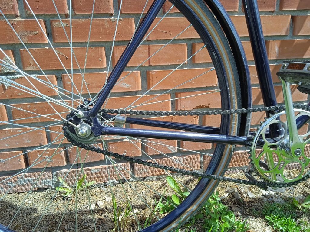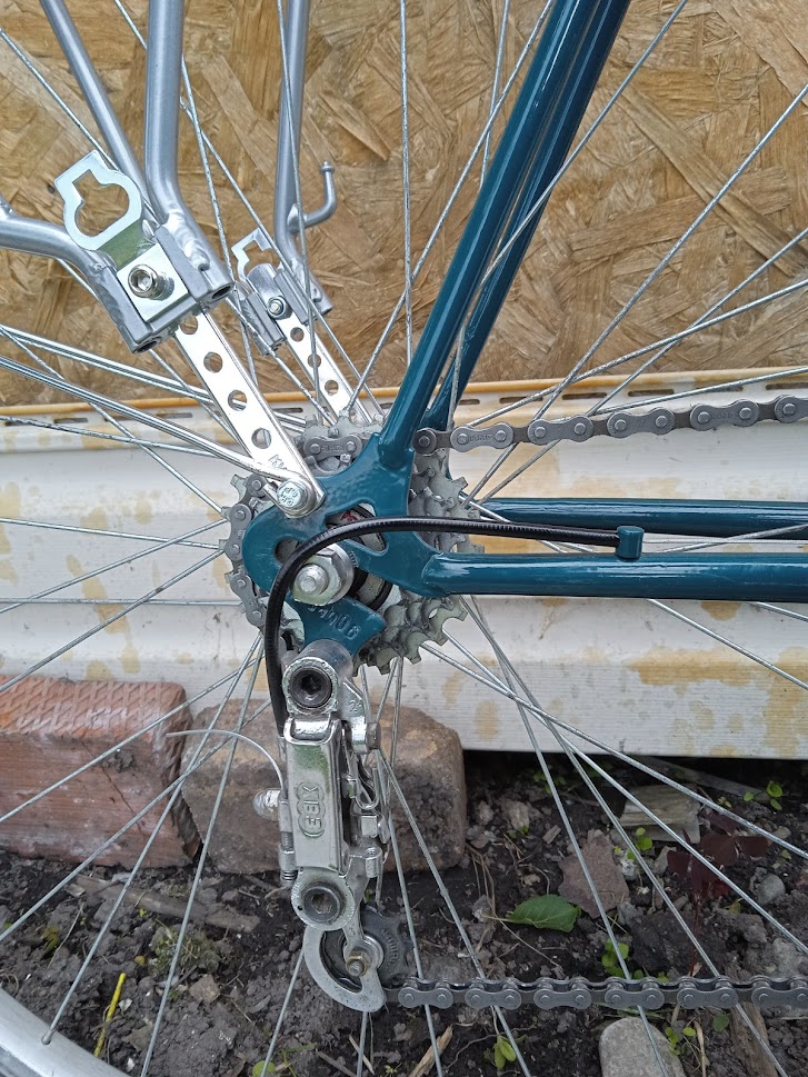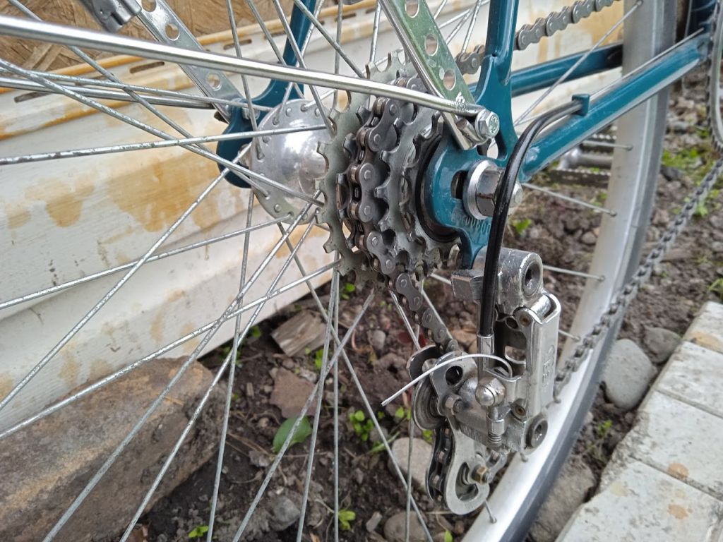 Тормоза, крылья, седло и всякие мелочи пришли в разное время в виде велобарахла. Передача 49-19. Цепь — новая советская Даугавпилского завода. Несколько цепей в солидоле и заводской упаковке подарил один ветеран с работы. Рама, крылья и обода крашены порошком в RAL5004, плюс слой лака.