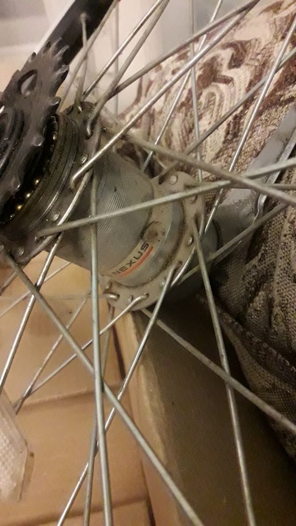 Справа на оси должна быть гайка, контрящая конус (на фото не понятно — есть или нет, обычно она светлая). Слева должны быть две узкие контргайки (у тормозного рычага), фигурная шайба с "усом", шайба с насечкой (не обязательно) и колпачковая гайка.