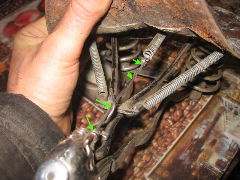 Одна пружина сдохла, а её проволочка живая. Одна такая удлинённая пружина выжила. Сидуха выведена их эксплуатации из-за того, что самопальная шкура убилась неправильным закреплением