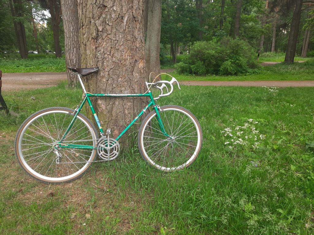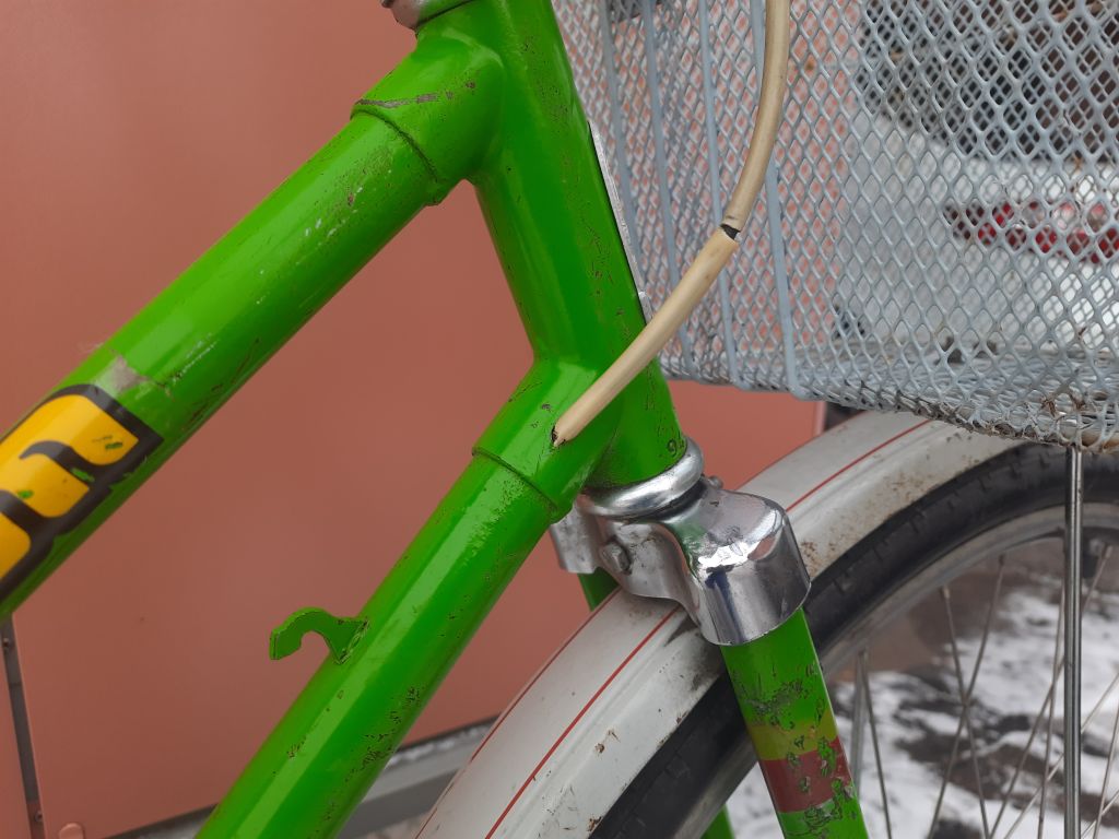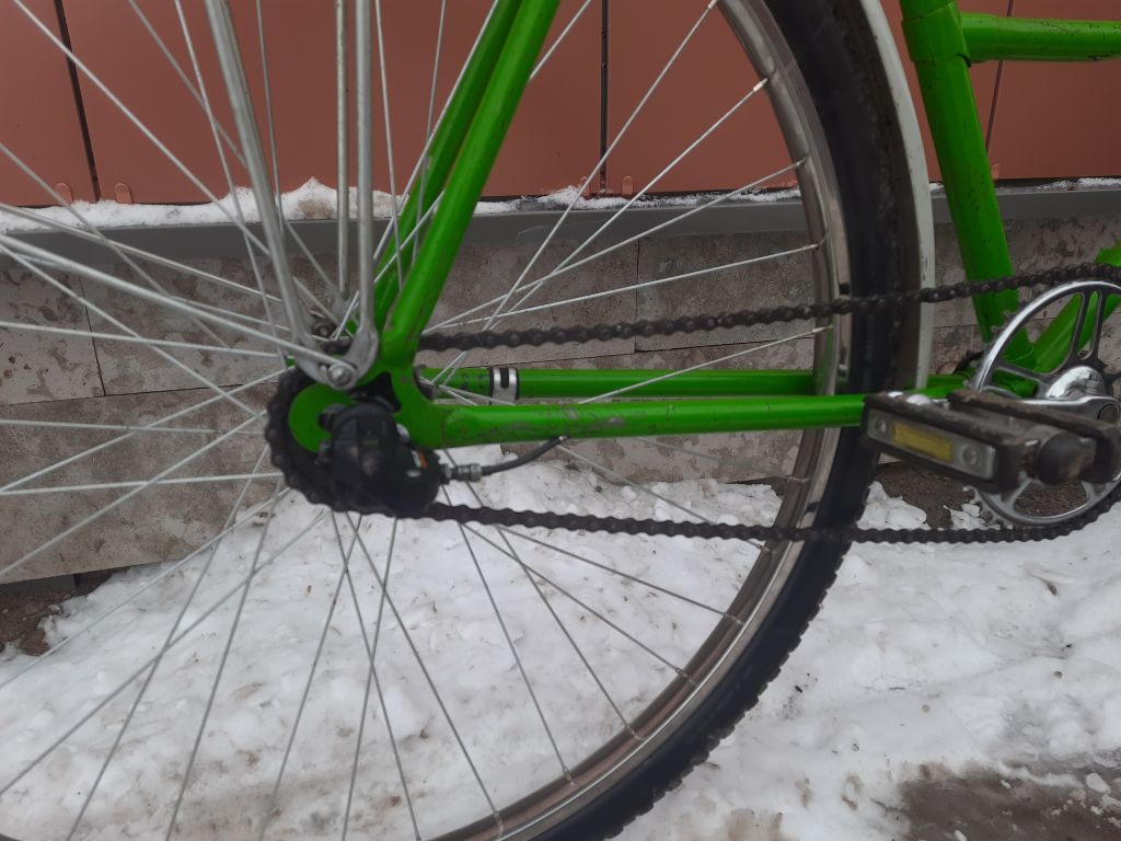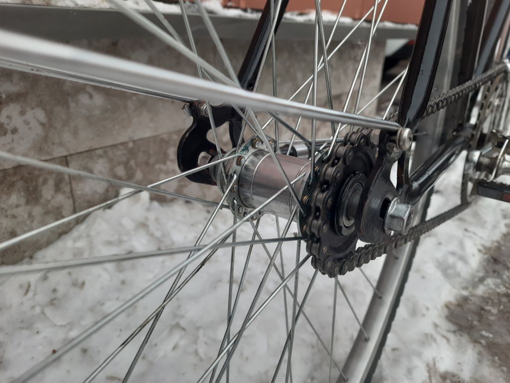 Достался мне с задним колесом, которое теперь на Ласточке. С неё колесо пошло сюда. Стальной хромированный обод шириной 25мм. Планетарка шимано 3 скорости , нерж. Спици в три креста с шайбами. Резина бу с авито Фолдинговые покрышки Ritchey Speedmax 40x700c.