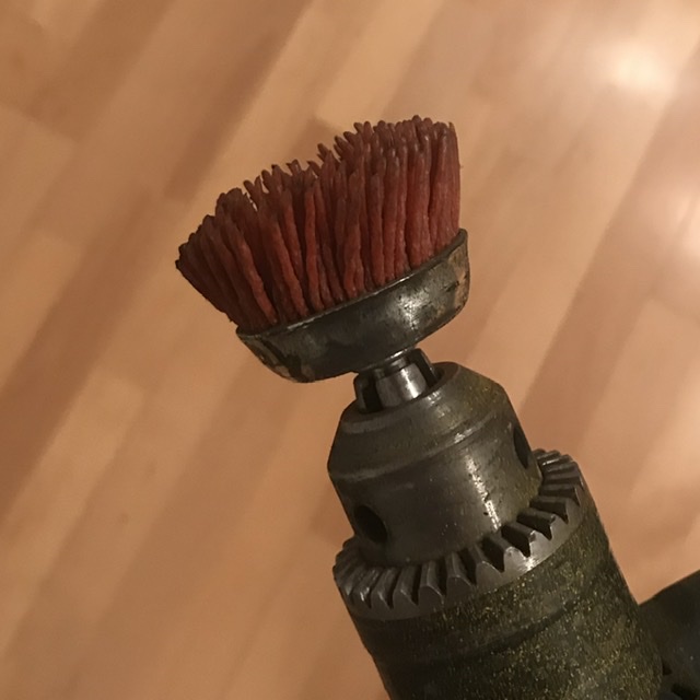 Старую краску удаляю обратной кромкой хорошего ножа, проще говоря соскабливаю, наждачной шкуркой и вот такой щеткой