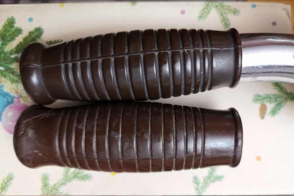 Грипсы такого типа, насколько я понимаю, делались не конкретными заводами, а отдельным предприятием, находившимся в системе МВД, поэтому они практически одинаковы для всех велосипедов, на которых применялись. Отличия в оттенке ПВХ и его жесткости связаны с разными партиями исходного сырья, из которого эти грипсы изготавливались, и по разному протекающими процессами старения, в реальной жизни. По моим оценкам, самая "молодая" коричневая грипса подобного типа имеет возраст около 45 лет, позже они уже были "условно белыми".