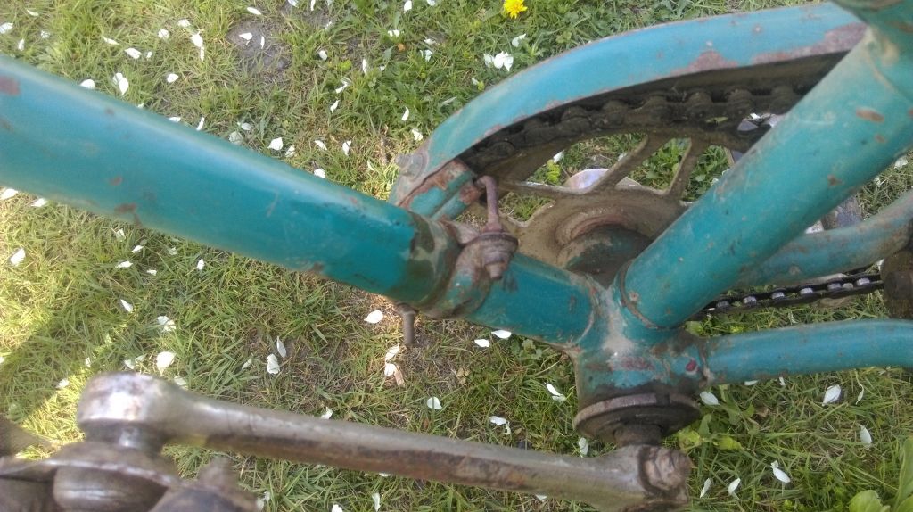 Доброго здоров'я. Прошу допомоги у визначенні велосипеда. "дістався у спадщину" разом із дружиною. Тобто був знайдений на горищі стодоли разом із іншими рамами старих велосипедів(ЗІС, Україна і тд.) Мій тесть, якому належить стодола, сказав що це рама німецького ще з війни. товщина труби рами — 29мм. На рамі, на підсидільному кріпленні проглядається  №225. більше номерів не видно. окремо від рами в гаражі знайдено — натягувачі ланцюга та кріплення фари із буквою "G", заднє колесо із втулкою "torpedo"(року випуску не прочитав, затерта, але орел не стандартний, на фото видно) сідло із підсиділом  буквою "Г". Ще  запитання : яка із педалей рідна? Дякую за відповіді.Помогите определить  велосипед, раму, детали. Без регистрации.