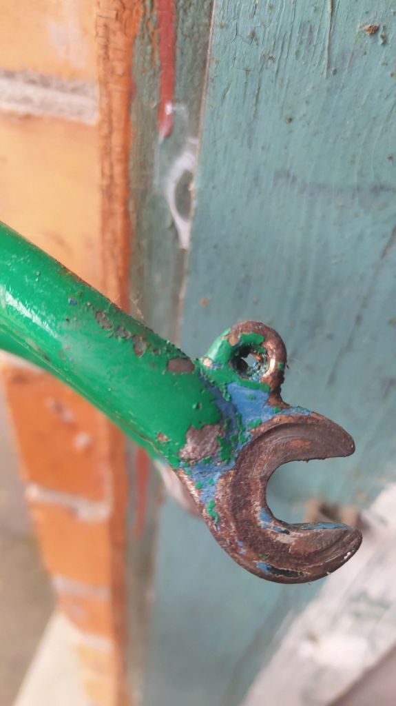 Задачи оставить ЛКП в принципе нет. Поэтому руки развязаны. Сперва жидкостью для снятия краски. Открылась предыдущая синяя краска. Совпадала с участками краски на раме. Что косвенно подтвердило что они родня.