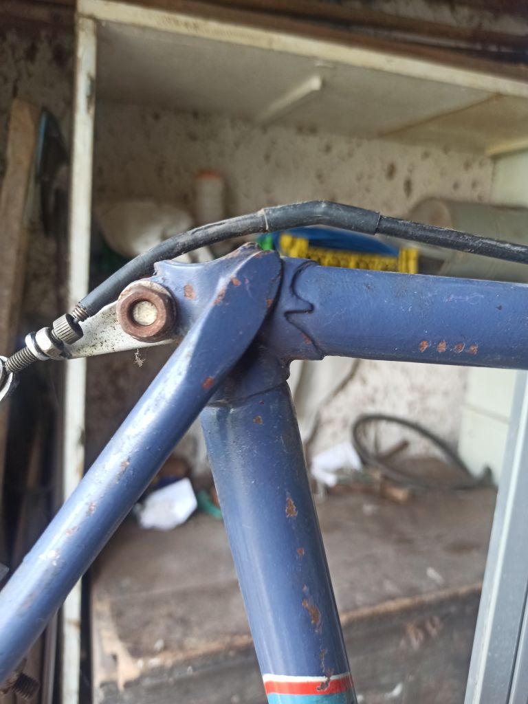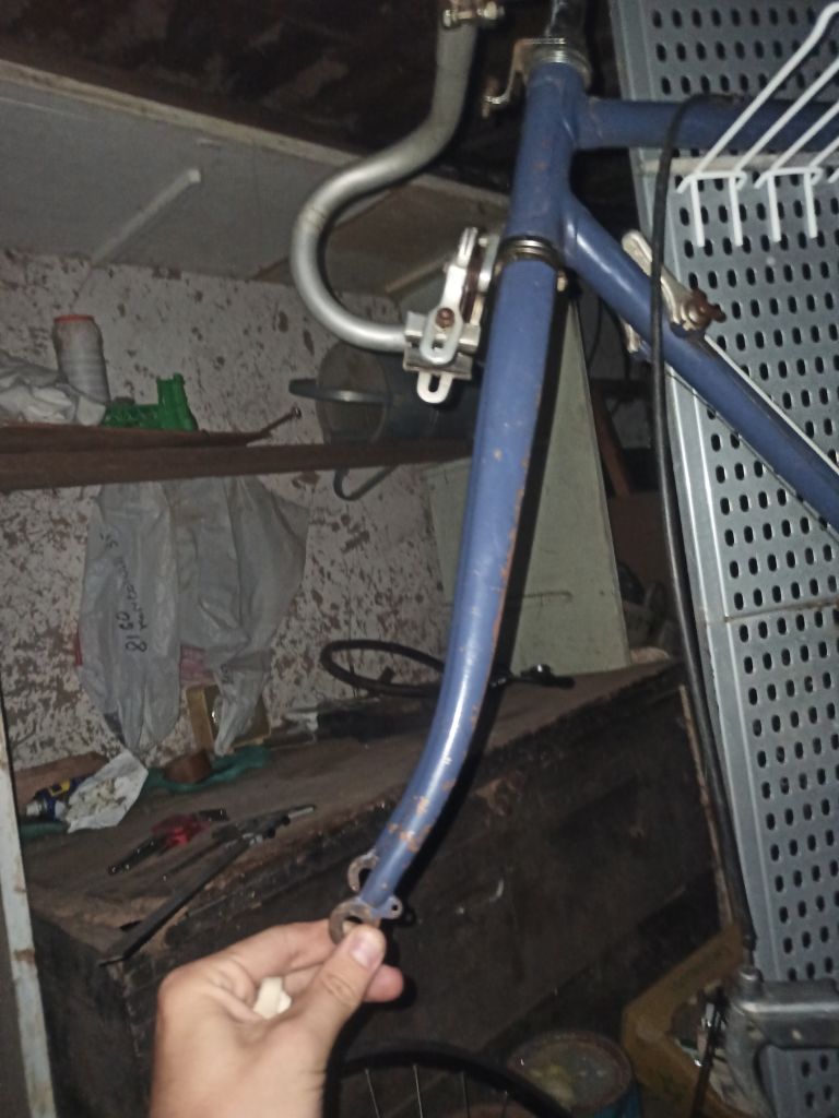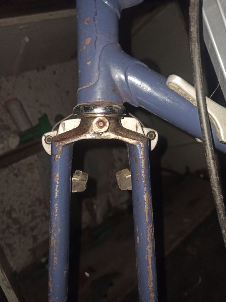 Вилка похожа чуть не на В-54, дропы — на какие-то буржуйские 80-х годов. Год (или что это за цифры)на них выбит необычным шрифтом, и похоже, они припаяны не на заводе. Подседельный узел — ХВЗ до 78-79 года, но какой-то слишком аккуратный. Верхний мостик похож  на СЗ, верх перьев заделан по-спецзаказовски, да как-то не совсем.