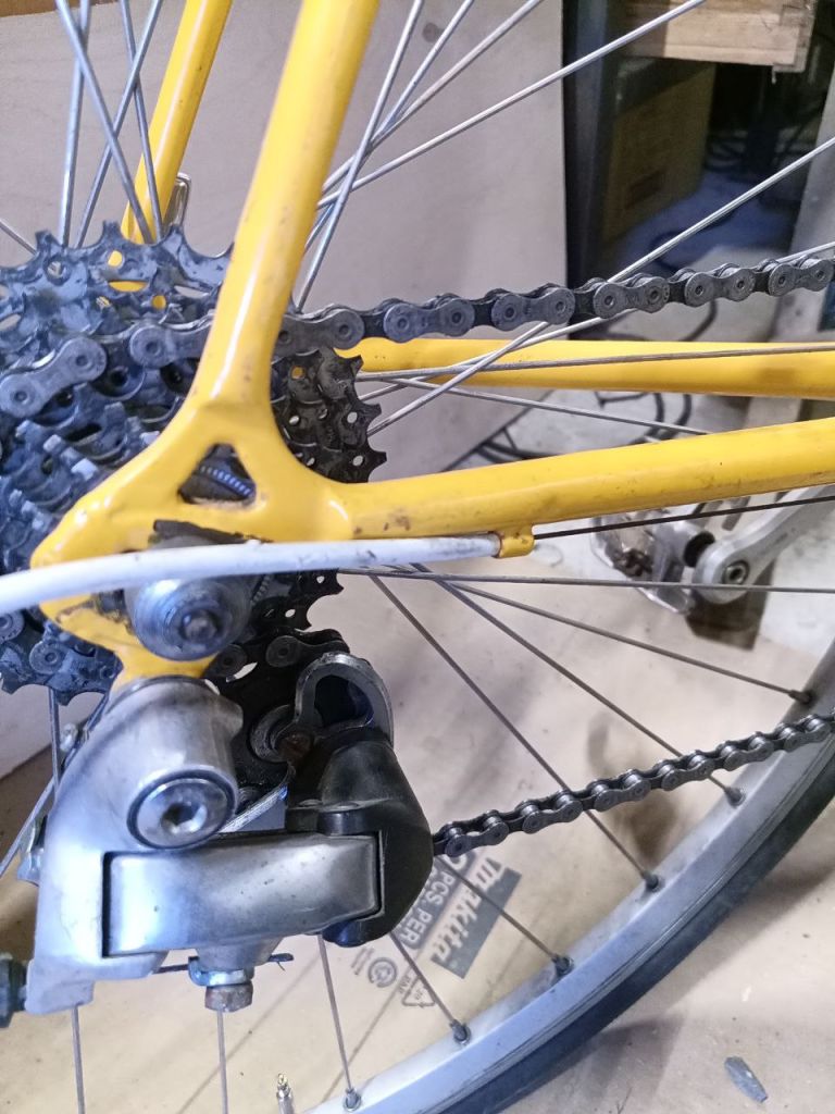 Трубы переднего треугольника профилированные до ромба, прямо как у какой-то Кольнаги Мастер )). Однако узлы совершенно другие, рулевая — под советский стандарт, резьба в кареточном стакане — спецзаказовская (правая-правая метрическая). Дропы кованые (штампованные). Нигде никаких цифр нет. Рама мне попала голая, отпескоструенная, так что и по оригинальной раскраске ничего не знаю
